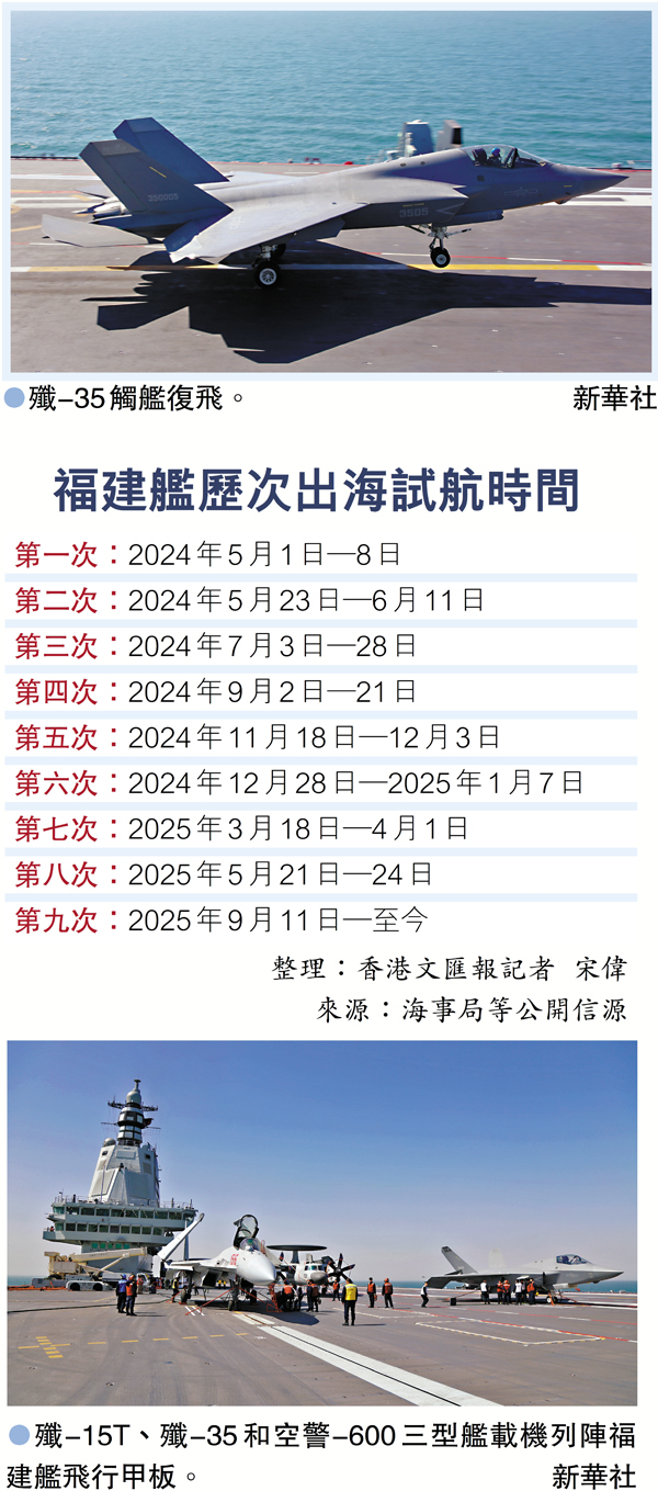 據央視新聞22日報道,在九三閱兵上受閱的殲-15T、殲-35和空警-600三型艦載機,已於此前完成在福建艦上首次彈射起飛和着艦訓練,標誌着福建艦具備了電磁彈射和回收能力。這也是中國首次在彈射型航母上實現多型號先進艦載機的電磁彈射和阻攔着艦。有軍事專家表示,此次試驗試訓的成功,是艦載機與航母核心技術的「雙向賦能」。隨着越來越多型號艦載機上艦運用,中國航母編隊遠海作戰能力將實現「代際升級」。 ●香港文匯報記者 宋偉