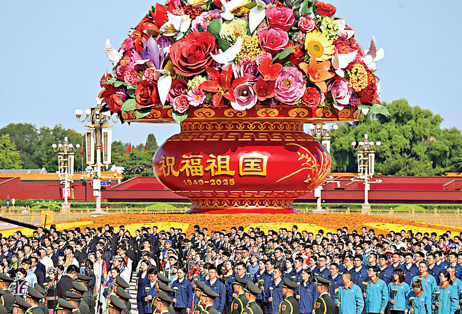 莊嚴的天安門廣場上,鮮艷的五星紅旗高高飄揚,人民英雄紀念碑巍然矗立。廣場中央,「祝福祖國」巨型花籃表達着對祖國繁榮昌盛的美好祝願。紀念碑北側,兩組花壇上白菊等鮮花組成的18個花環,寄託着全體中華兒女對英烈的深情追思。