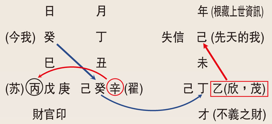 因為他的前妻翟欣欣,姓名五行是辛金乙木乙木,不但從姓名苏姓丙火與翟姓辛金互動,就會出現「丙辛」一拍即合的效果。更重要的是在苏享茂的八字內,出現了翟欣欣的全姓名五行辛金乙木,而又安排了與日支的夫妻宮有互動糾纏,按概率機會是非常低的。一出生就出現此痕跡,不是宿命又是什麼?現試從苏享茂的八字追蹤他與翟欣欣的上生的因果痕跡。
