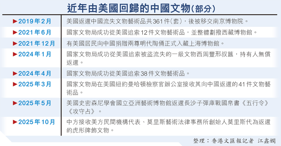 香港文匯報訊(記者 江鑫嫻 北京報道)中國流失文物再傳回歸好消息。中國駐美國大使館發布消息稱,華盛頓時間10月16日,中國駐美國大使謝鋒代表中國政府接收美方民間機構代表、莫里斯藝術法律事務所創始人莫里斯代為返還的虎形牌飾文物。謝鋒表示,中方將通過文物展覽等方式,向更多的人講述虎形牌飾文物背後的中美動人故事,把兩國人民的友好情誼傳遞下去。歡迎更多有識之士支持並參與推動流失文物返還原屬國。