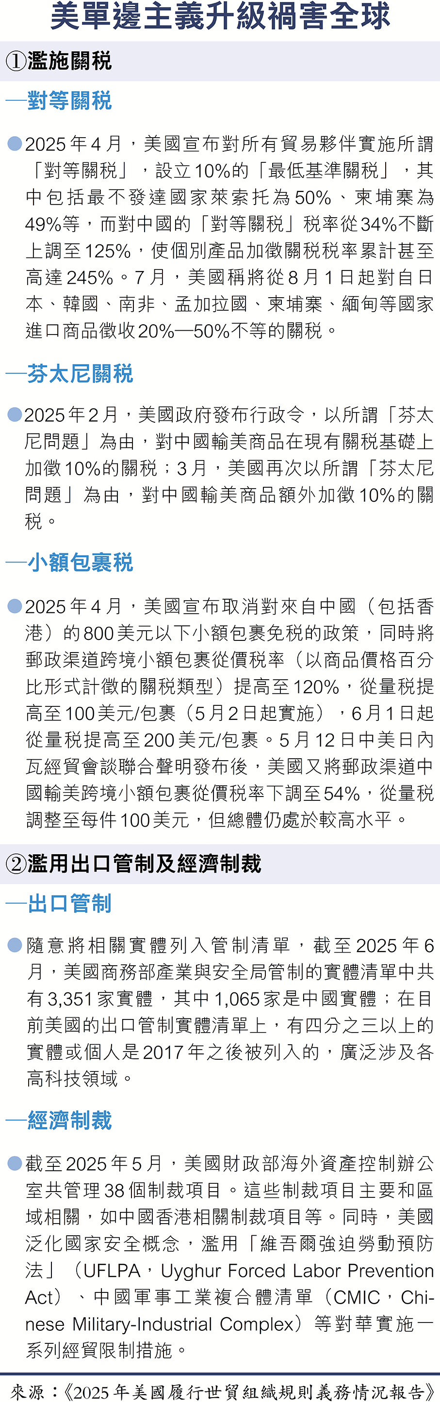 中國商務部17日發布《2025年美國履行世貿組織規則義務情況報告》(簡稱《報告》),直指美國作為世界第一大經濟體及多邊貿易體制的重要創立者和主要受益者,以「美國第一」為出發點,任意實施所謂「對等關稅」等各類單邊關稅措施,給多邊貿易體制帶來嚴峻挑戰,損害世貿組織成員共同利益和各國人民福祉。商務部世貿司負責人表示,美不斷升級單邊主義措施,頻繁實施歧視性政策,推出所謂「對等關稅」,發動全球貿易戰,嚴重侵犯各國正當權益,嚴重違反世貿組織規則,嚴重損害以規則為基礎的多邊貿易體制。希望通過2025年報告的發布,敦促美方及時糾正錯誤做法,盡快取消「對等關稅」等違規措施。有專家對香港文匯報表示,雖然該報告已連續發布多年,但這並不是簡單的年度例行動作,而是中方在全球貿易秩序重構關鍵期的一次「規則反擊」,為未來構建一個更公平、更具包容性的國際經貿規則體系打下了基礎。