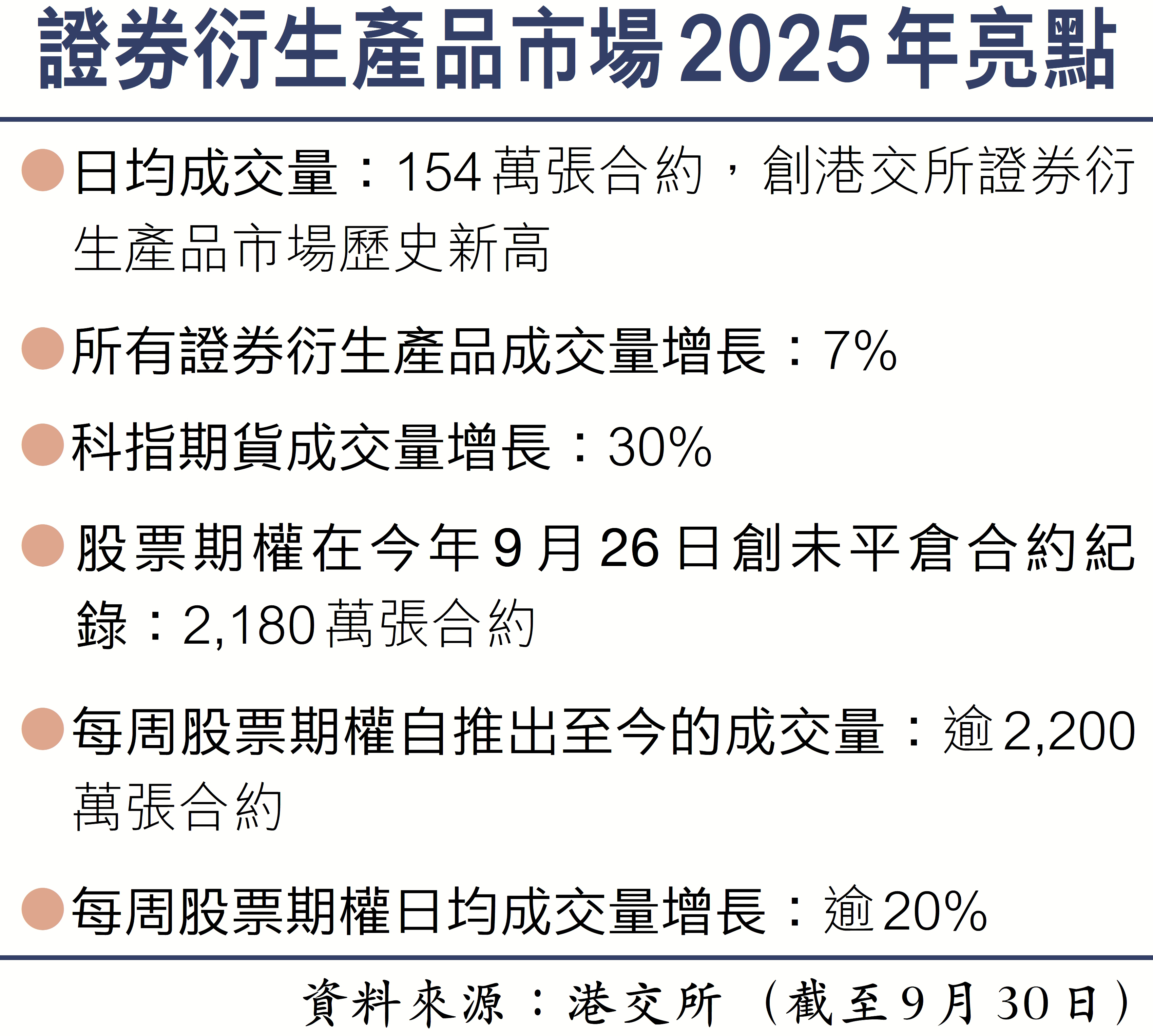 今年港股成交活躍,帶動證券衍生產品市場興旺,當中所有證券衍生產品的成交量增長為7%,而恒指科指期貨的成交量卻有三成的增幅,表現非常突出。此外,每周股票期權是港交所近年發展最迅速的產品之一,自去年11月推出以來,成交量已逾2,200萬張合約,今年的日均成交量增長20%,在今年第3季佔相關股票期權產品成交量約22%。而10月2日當天,相關產品的成交量更有近31.3萬張,創出單日新高。