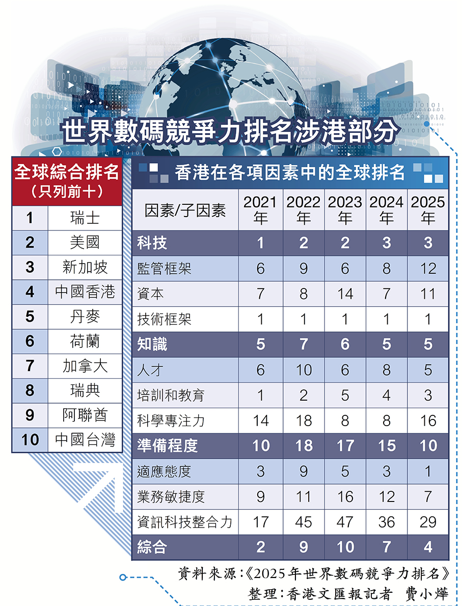 國際管理發展學院昨日發布《2025年世界數碼競爭力排名》,香港在全球排行第四,僅次於瑞士、美國及新加坡,是繼去年上升三位後再升三位(見表)。在三個評分因素中,香港繼續在科技和知識方面表現出色,排名分別維持在全球第三位及第五位;準備程度的排名更跳升五位至第十位。在各子因素中,香港於技術框架及適應態度俱排名全球首位,人才及「培訓和教育」亦位列五強。中國內地則在綜合排名位列第十二,較去年上升兩位。香港特區政府發言人昨日表示,排名繼續肯定香港是全球最具數碼競爭力的經濟體之一。香港同時擁有國家和國際機遇的雙重疊加優勢,加上蓬勃的創業生態系統、自由和公平開放的營商環境、簡單低稅制和堅實的政策支持,能吸引各地企業、人才和技術匯聚香港,為進一步推動創科合作和發展奠定穩固基礎。 ●香港文匯報記者 費小燁