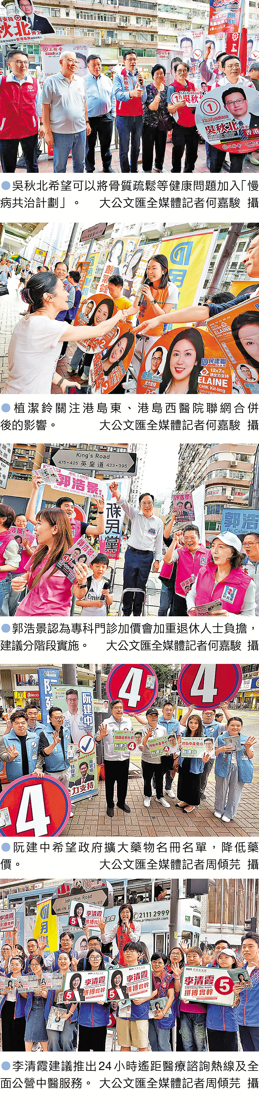 香港文匯報訊(大公文匯全媒體記者 義昊、周傾芫)昨日下午,港島東選區5名參選人在港鐵北角站外設立街站,向市民介紹政綱。他們都不約而同提到基層醫療與人口老齡化的議題,有參選人呼籲擴大「慢病共治計劃」範圍及醫管局藥物名冊名單,亦有參選人呼籲將自願醫保計劃的保障範圍擴大至中醫醫院服務,推動全面公營牙科服務計劃等,並呼籲政府推出不同措施,更好照顧長者需要。