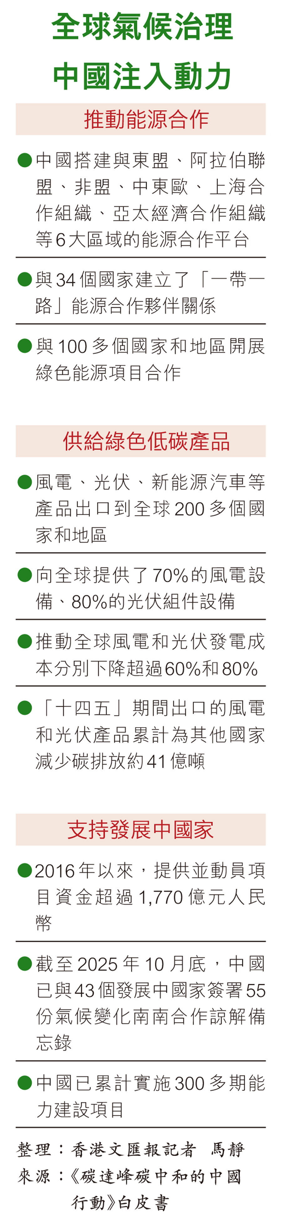 中國已向《公約》秘書處提交了2035年國家自主貢獻目標,歷史性地擴展到全經濟範圍、包括所有溫室氣體,為COP30注入了來自最大發展中國家的引領力。過去10年間,中國始終以負責任大國的姿態,堅定履行國家自主貢獻承諾。在COP30會場內外,國際社會對中國為氣候變化作出的努力和貢獻給予肯定,並關注中國方案的引領與全球推動。 ●香港文匯報綜合記者馬靜、