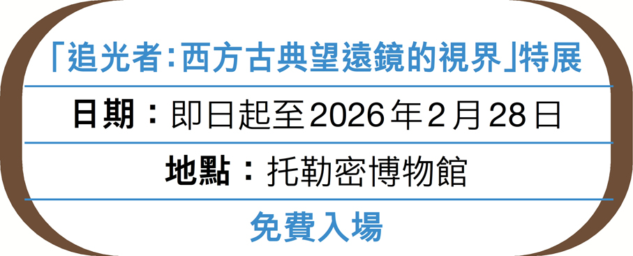 人類「追光」的歷史可追溯千百年,東方有夜觀星際天象、洞察四象變化,西方亦有倚靠早期科學技術觀察天空的記錄,各含玄機。近日,托勒密博物館在葵芳展廳推出年度特展「追光者:西方古典望遠鏡的視界」。展覽以托勒密博物館珍藏的歐洲古董望遠鏡為核心,梳理從古希臘到近代科學革命期間,人類認識光學、拓展視界、追逐星光的偉大征程。 ●文、攝:香港文匯報記者 胡茜這場融合文物珍品、科技互動與藝術創作的展覽,將帶領觀眾從地中海到銀河系,完成一場貫穿人類文明史的光學漫遊。