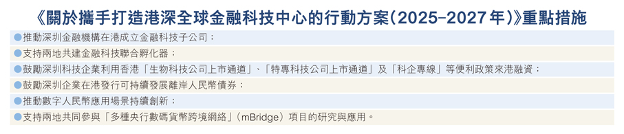 對於此次港深攜手加強金融科技領域合作,深圳市地方金融監督管理局局長時衛幹昨表示,此舉是為落實中央金融工作會議精神和國家《推動數字金融高質量發展行動方案》的工作部署,充分發揮深港兩地在金融科技領域先發優勢,今年3月兩地啟動政策聯合調研,並依託前海、河套、北部都會區等戰略平台,聯合編制了此份三年行動方案。