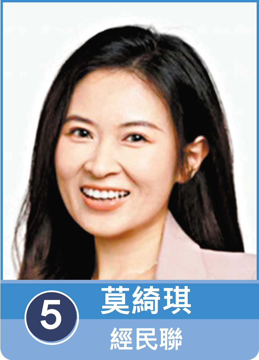 5號候選人莫綺琪是葵青區區議員,首次參選新界西南地方選區。她表示,自己在屋邨長大,當選區議員後積極服務地區,親歷基層青年就業、擇業以及創業面臨困局。因此她承諾晉身立法會後,將會結合她個人的經歷與政團工商專業,為基層青年進階生涯發聲、為經濟改善民生出力、為女性獨立傳愛助力。