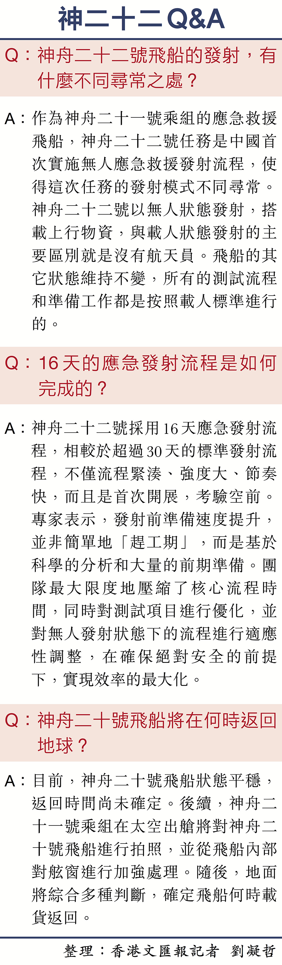 香港文匯報訊(記者 劉凝哲 北京報道)中國載人航天工程首次應急發射任務取得圓滿成功。11月25日12時11分,搭載神舟二十二號飛船的長征二號F運載火箭,在酒泉衛星發射中心點火發射,約10分鐘後,飛船與火箭成功分離並進入預定軌道。約三個半小時後,飛船成功對接於空間站天和核心艙前向端口。這艘滿載貨物的神二十二飛船,為中國空間站中的神舟二十一號航天員送來「太空燒烤」雞翅、牛排等物資,並將護送他們在完成任務後返回地球。至此,為期20天的中國首次太空應急救援圓滿成功,在浩瀚星海中書寫了一段溫暖而堅定的航天篇章。