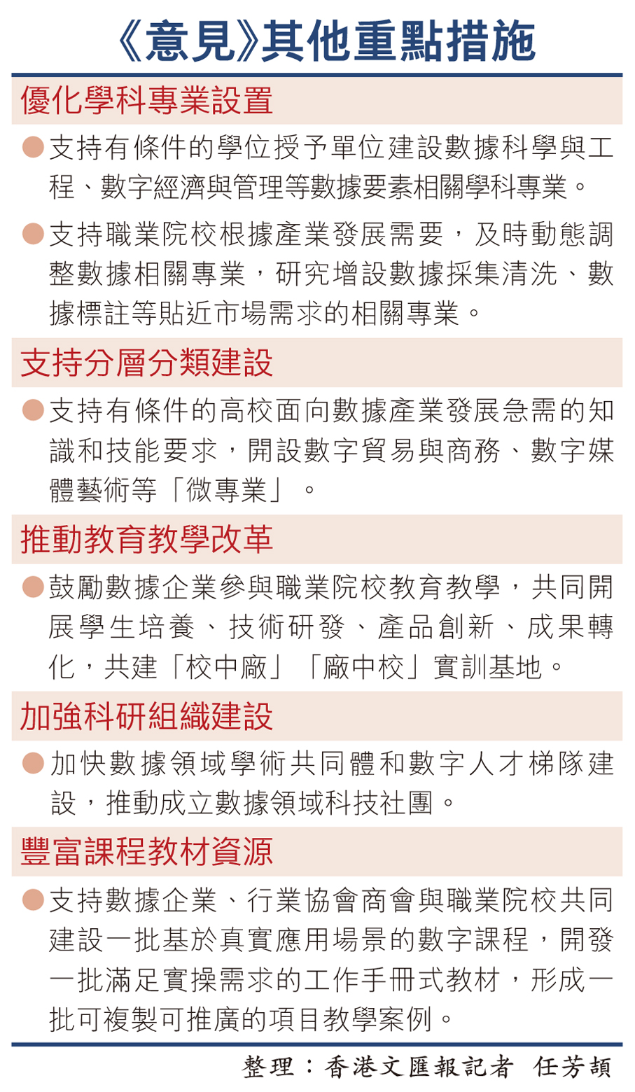 香港文匯報訊(記者 任芳頡 北京報道)國家發展改革委、國家數據局、教育部等五部門近日出台《關於加強數據要素學科專業建設和數字人才隊伍建設的意見》(以下簡稱《意見》),旨在激活數據要素賦能新質生產力的創新引擎作用,促進數據領域教育鏈、人才鏈與產業鏈、創新鏈融合發展。其中特別提到,健全數據要素學科專業,支持有條件的綜合性高校建設數字學院,整合校內相關學科資源。專家對香港文匯報表示,文件出台標誌着中國數字人才建設邁向系統化、專業化新階段,有助於系統解決數字人才供給的結構性失衡與供需錯配問題,為高質量發展注入核心動能。