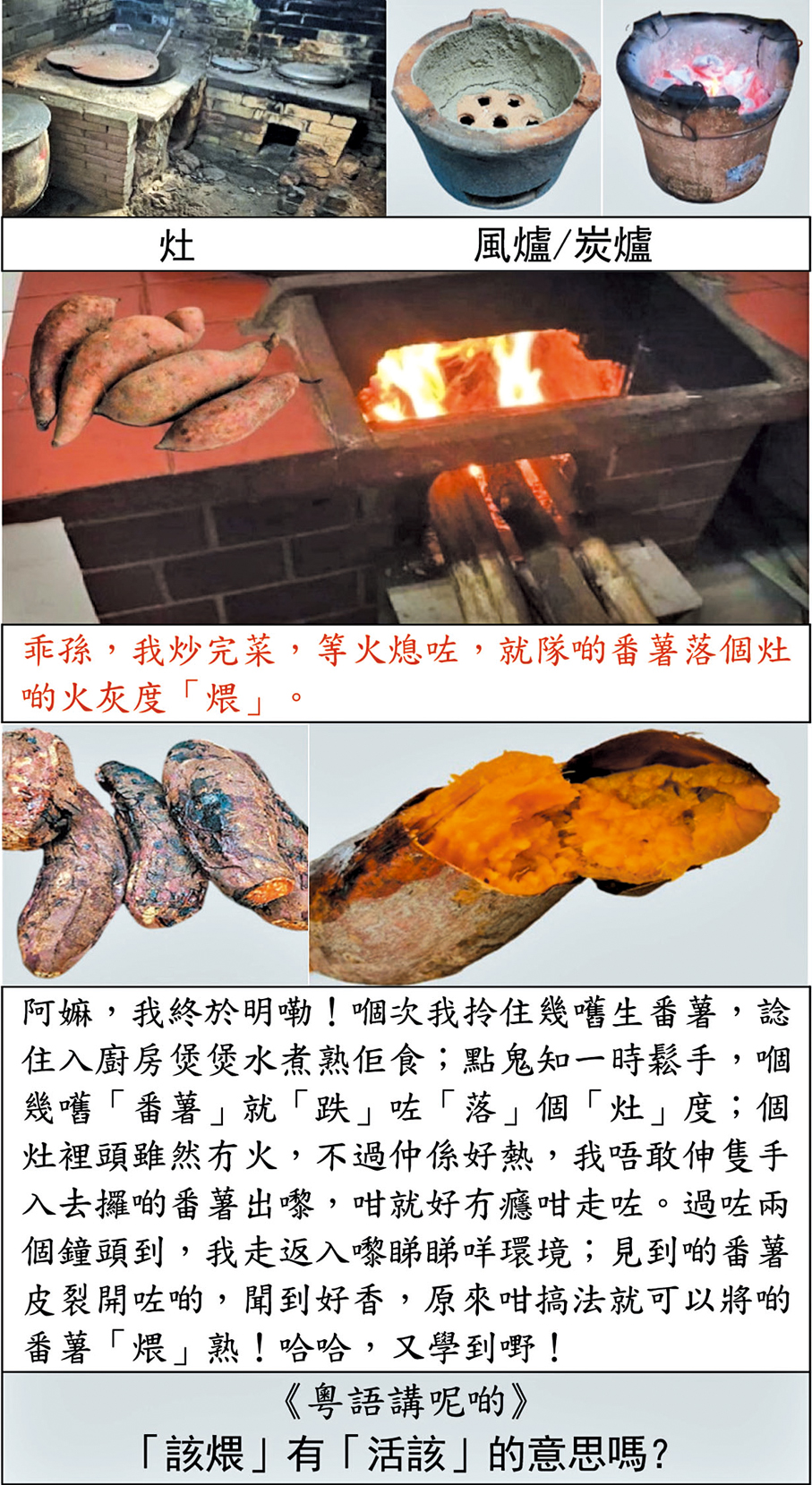 「煨/回4-1」是把生食埋在火灰中燒熟的一種烹飪方法。根據筆者的考究,如有番薯掉進灶裏的火灰中,應「該」會被「煨」熟或一「概」(音近「該」)被「煨」熟。據此,廣東人才會生成以下一個歇後語: