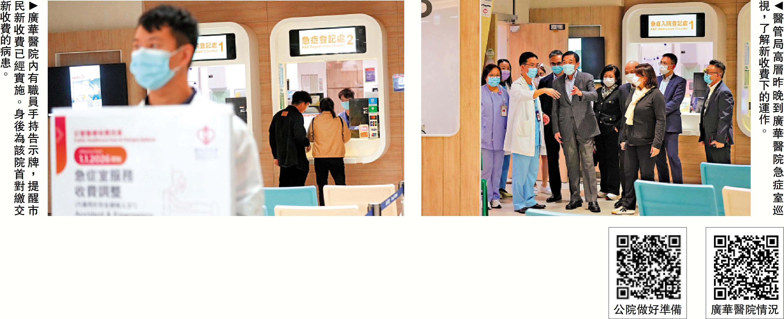 至晚上約11時,醫管局主席范鴻齡、行政總裁李夏茵到廣華醫院視察新收費實施情況。大公報記者在急症室聽到有廣播提醒市民,即將實行新收費,未辦理登記手續的市民應盡快前往辦理。