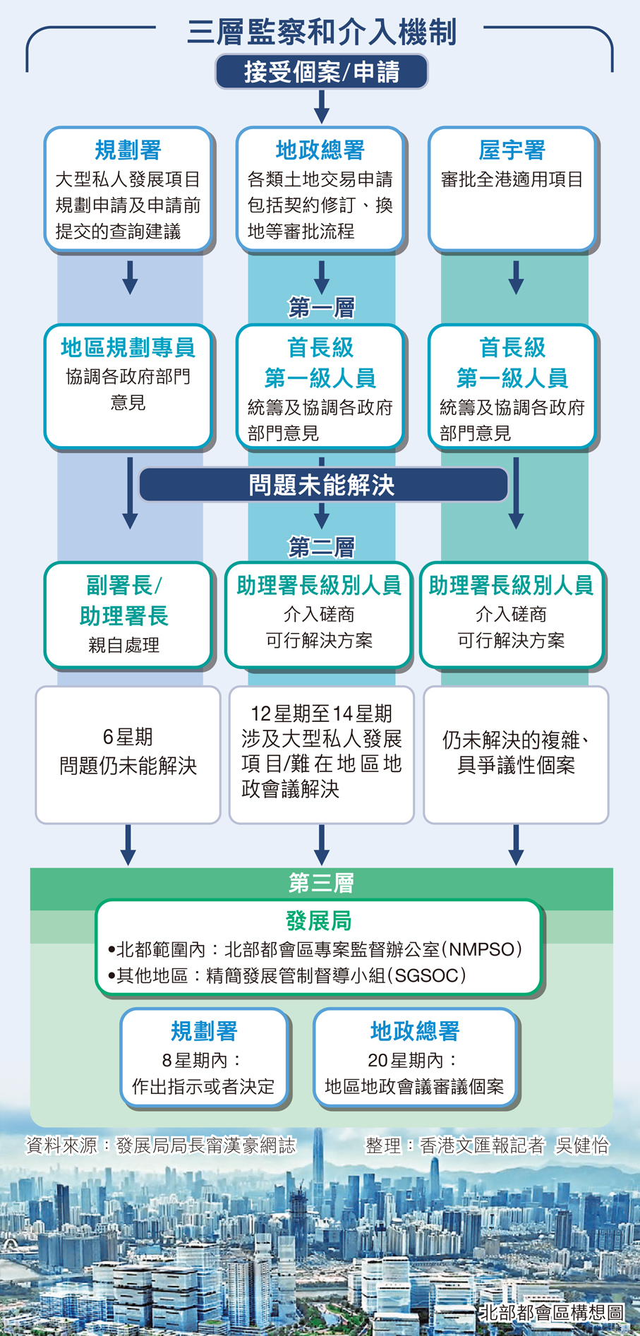 在新措施下,屋宇署在審批全港適用項目的流程,亦會設立三層監察和介入機制。第一層先由屋宇署首長級第一級人員統籌及協調各部門的意見,按需要聯同部門代表共同商討審批原則性事宜,倘問題未能解決,則將個案轉介到第二層,即由屋宇署助理署長級人員介入磋商可行解決方案。倘第二層仍未解決複雜及具爭議性的個案,則交由第三層,由發展局領導的兩個小組,即北部都會區專案監督辦公室,以及精簡發展管制督導小組集中處理。