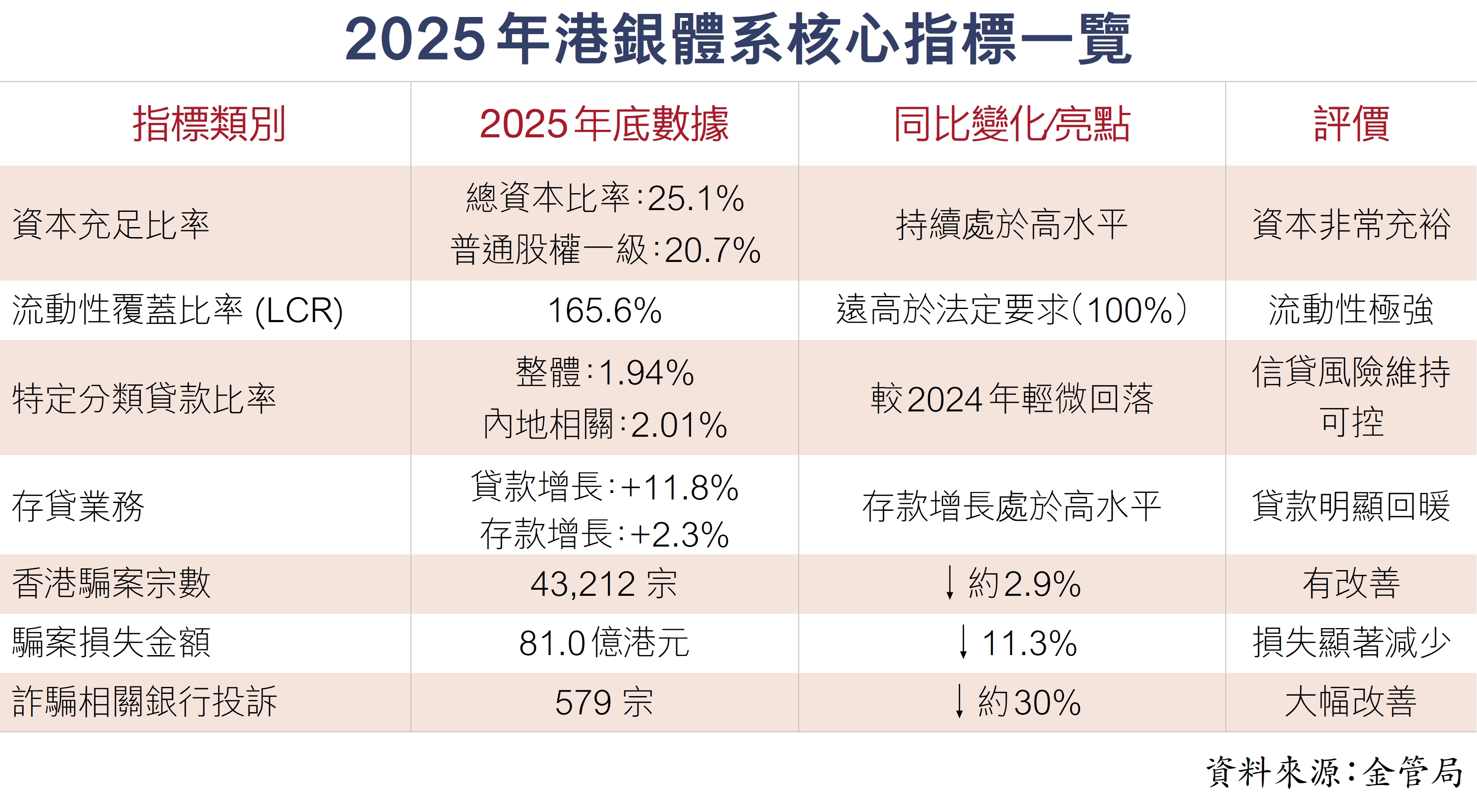 金管局昨公布《香港銀行體系:2025年回顧與2026年工作重點》,多項核心指標顯示本港銀行業在穩健基礎上持續向好,其中存貸業務表現良好,去年港銀存款總量增長逾11.8%,期內貸款更錄得3年收縮後首次反彈,按年升2.3%。雖然去年整體貸款的特定分類貸款比率升至2.01%,較2024年底擴大0.05個百分點,金管局副總裁阮國恒昨強調,港銀財務狀況穩健,商業房地產行業雖面臨挑戰,但撥備覆蓋充足,現時銀行不計抵押品的撥備覆蓋率約65%,計及抵押品變現價值的撥備覆蓋率已達150%,整體信貸風險完全可控。 ●香港文匯報記者 周紹基