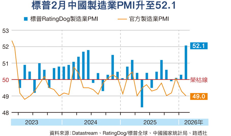 香港文匯報訊(記者 倪巍晨 上海報道)受惠於內地供需同步走強,標普和RatingDog昨聯合發布,2月經季節性調整的中國製造業採購經理人指數(PMI)升至52.1,為2020年12月以來最高。國家統計局同日發布的2月中國製造業PMI則回落至49,低於前值0.3個百分點。分析指出,兩大製造業數據雖略有分歧,但細分結構看,製造業整體仍具較強韌性,隨着市場對全國兩會支持政策發布預期的加強,以及節後各地逐步復工復產,官方製造業PMI大概率趨穩向上運行,標普PMI亦將保持擴張勢頭。