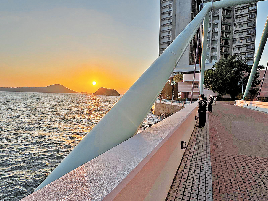 下午五點半,太陽開始往下走。海面由藍轉金,再由金褪成粉紫。對面的南丫島靜靜躺着,漁船緩緩駛過,在波光上拖出長長的影子。釣魚客在岸邊收竿,情侶依偎看海,跑步的人放慢腳步,拿出手機拍下這一刻。
