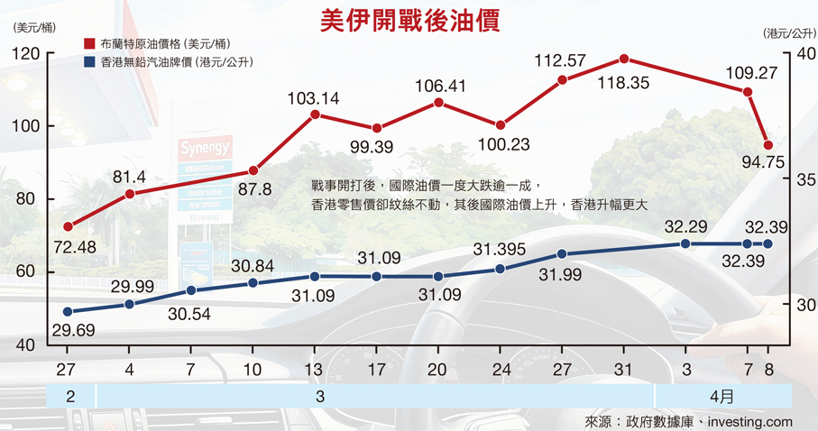 縮短時間線,細看近期香港零售牌價分析變化,再與布蘭特原油價格對比更能看出端倪。上月31日至本月1日國際原油一度下跌14.52%,從每桶118.35美元跌至101.16美元,香港無鉛汽油牌價卻維持在每升32.19元。本月2日國際原油價格回升後,香港部分油公司翌日帶頭加價至每升32.39元。但即便前日(4月7日)達成停戰協議,國際原油價格兩日分別下跌0.46%和13.29%,香港牌價仍維持每升32.39元(4月8日數據),紋絲不動。