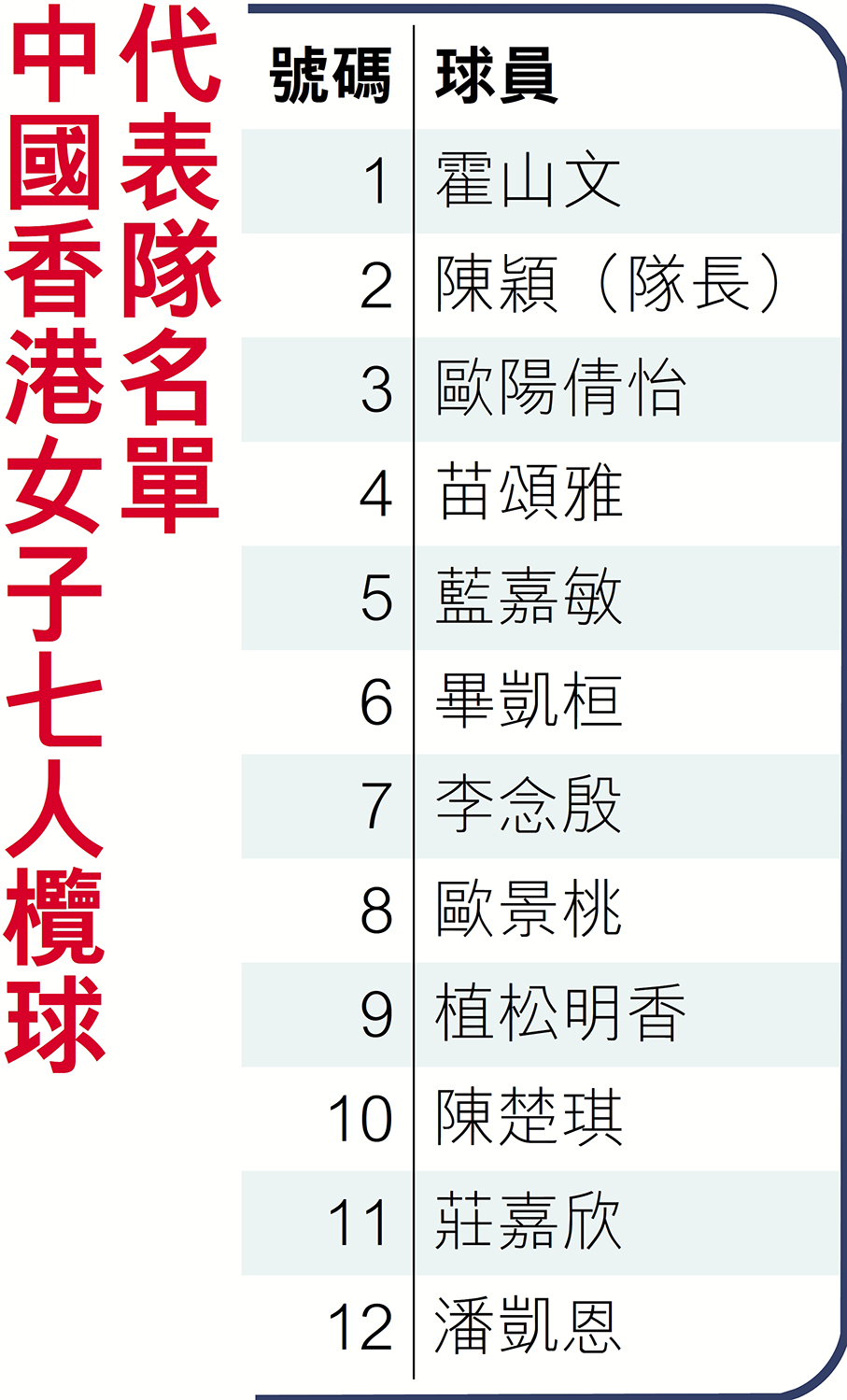 大會昨日亦同時公布「香港國際七人欖球賽」 的中國香港男女子代表隊成員名單,男子隊方面,房傑鋒相隔一屆再度入選「香港國際七人欖球賽」大軍名單,他高興地表示:「感覺好像要去到特別時刻才能入選,今屆是七欖50周年,上次入選則是七欖在香港大球場的最後一舞,其實今次入選是比上一次興奮,感覺到教練覺得我有進步,所以才選我入隊。」房傑鋒又笑言自己緊張到在領取球衣時也手震,「還未開始打已經有緊張感,希望到時候可以發揮出最佳水平。」