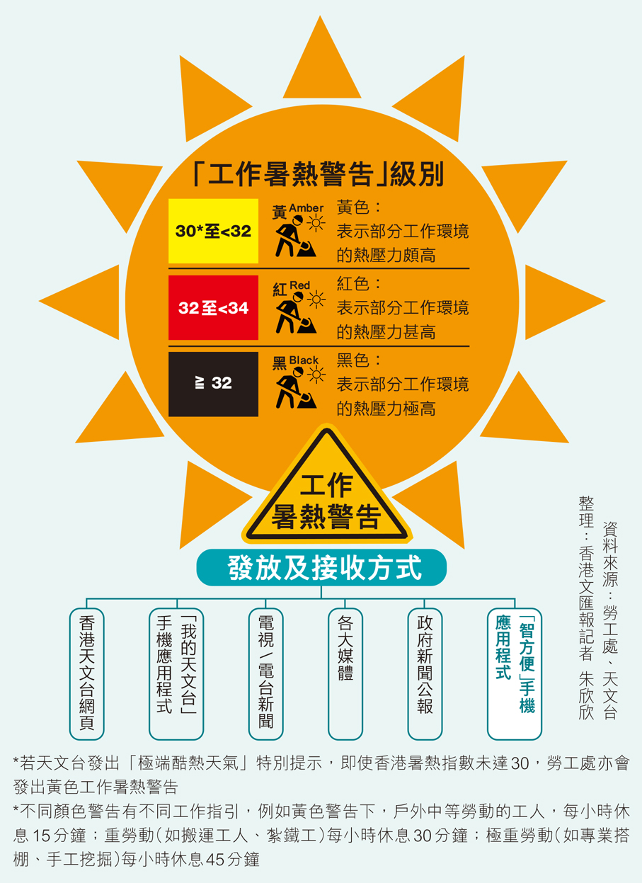 夏季將至,戶外及地盤等高溫作業環境中暑風險上升。勞工處昨日宣布,將於下周一(20日)起優化「工作暑熱警告」系統,在全港加入9個監測點,收集暑熱指數數據作為發出暑熱警告的準則,若當中4個監測點的熱壓力達警戒級別,即使天文台京士柏站的指數未達該水平,勞工處仍會發出對應的「工作暑熱警告」,更全面反映暑熱情況。同時,勞工處將加強保障僱員工作時的健康,並透過資助計劃,資助中小企購買冷氣背心、便攜式風扇等降溫裝備,以及加強巡查、宣傳及培訓,督促僱主落實防中暑措施。