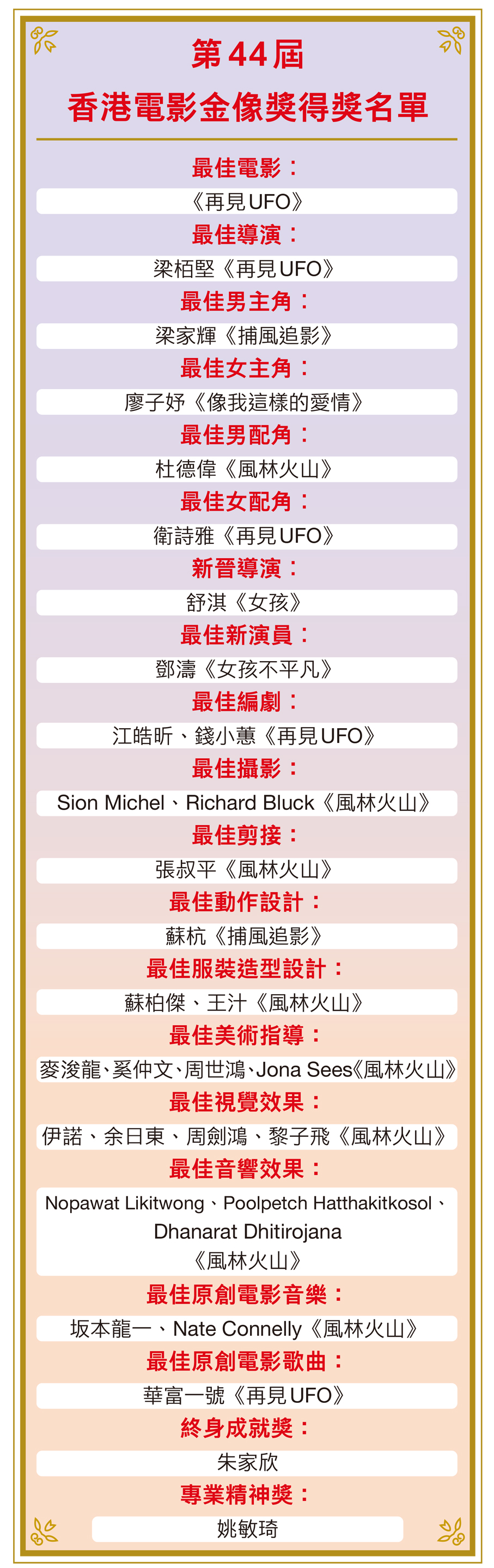 第44屆香港電影金像獎頒獎禮昨晚於香港文化中心舉行。《風林火山》囊括最佳攝影、最佳美術指導等8個獎項,成大贏家。梁家輝和廖子妤分別憑《捕風追影》及《像我這樣的愛情》拿下最佳男、女主角獎。舒淇29年前曾在金像獎獲頒新人獎,今年她憑《女孩》獲頒新晉導演獎項,她坦言感覺很奇妙。●香港文匯報記者 阿祖、達里、