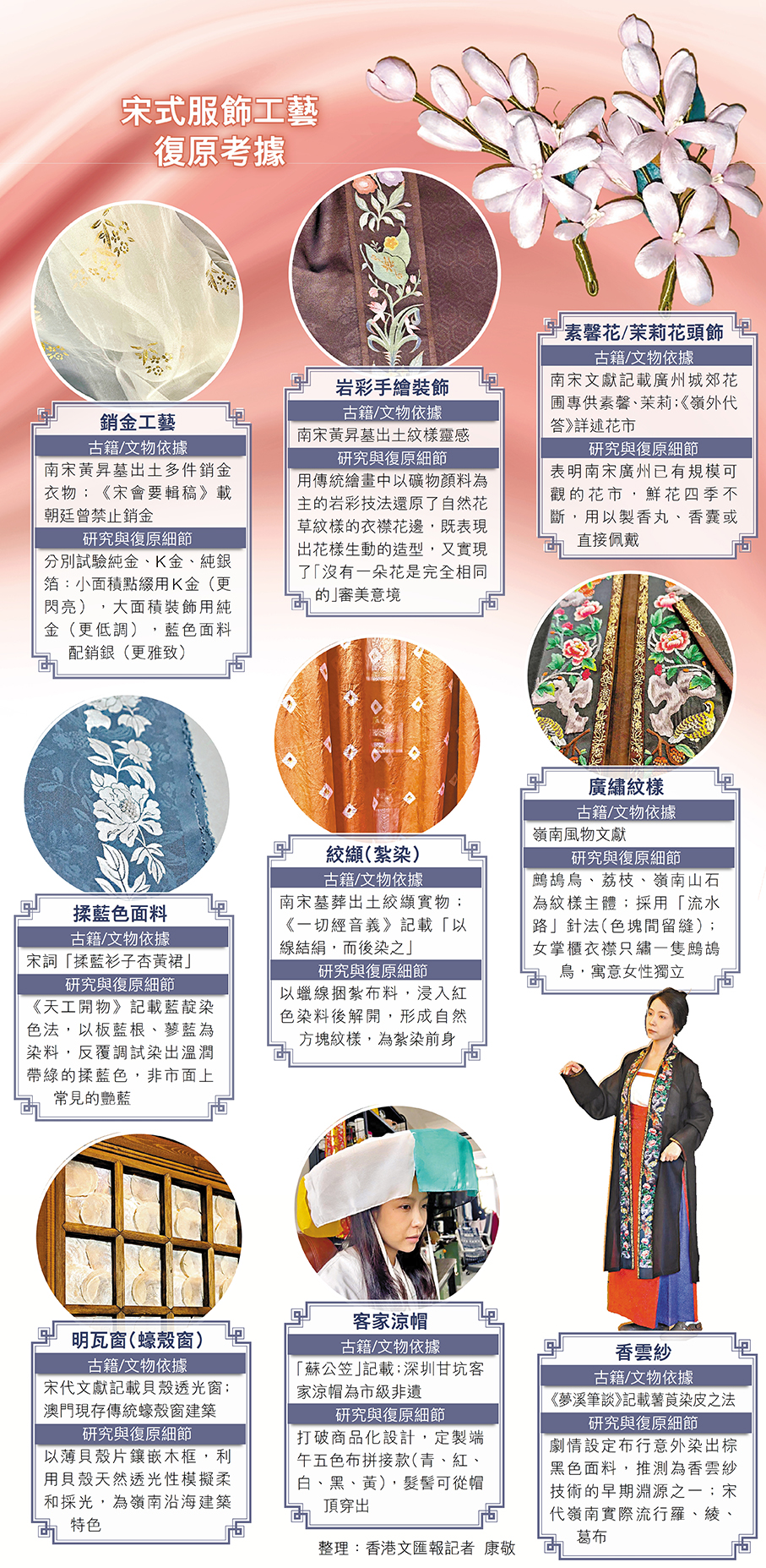 團隊還復原了澳門蠔殼窗(明瓦窗)——以貝殼薄片鑲嵌於木框,利用貝殼的透光性,模擬宋代建築的柔和採光。團隊更從文獻中發現,南宋廣州已是全國最大的花市之一,城郊花圃專門供應素馨花與茉莉花,香氣濃郁,用以製香丸、香囊或直接佩戴。為此,他們特意定製了素馨花與茉莉花頭飾。