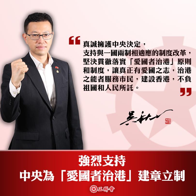 他重申,「我們擁護中央決定,支持一切與『一國兩制』相適應的制度改革,堅決貫徹落實『愛國者治港』理念和制度,讓真正有愛國之志,治港之能者服務市民,建設香港,不負祖國和人民所託。」