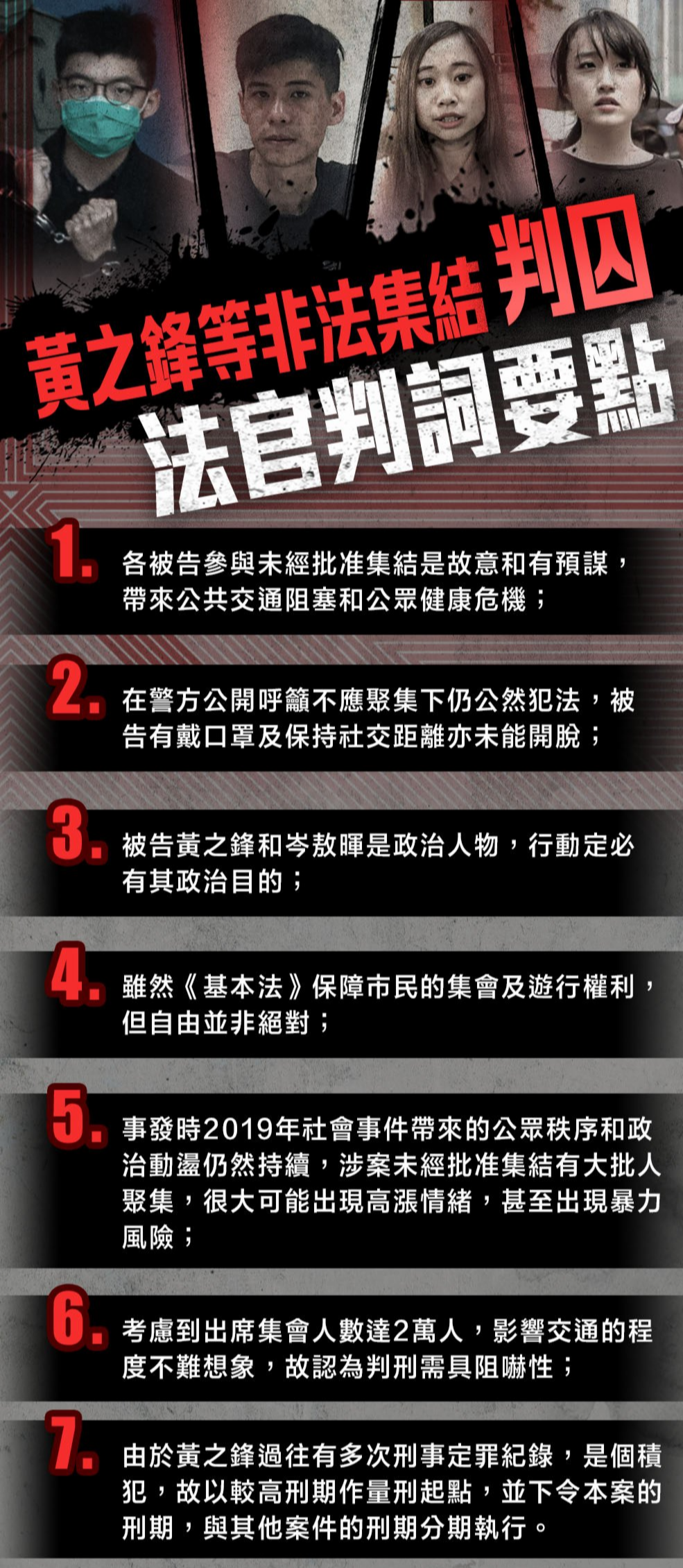 大公文匯全媒體報道:26名反對派人士去年六月舉行集會,涉嫌參與未經批准集結等罪,其中黃之鋒等4人早前承認明知而參與一個未經批准集結罪,今(6日)早於區域法院判刑。各人認罪扣減三分一刑期後,黃之鋒判囚10個月,與其他案件現正服4個月刑期分期執行。岑敖暉判囚6個月,袁嘉蔚及梁凱晴各判囚4個月。法官在庭上強調,雖然《基本法》保障市民的集會及遊行權利,但自由並非絕對;各被告參與未經批准集結是故意和有預謀,帶來公共交通阻塞和公眾健康危機,故認為判刑需具阻嚇性。