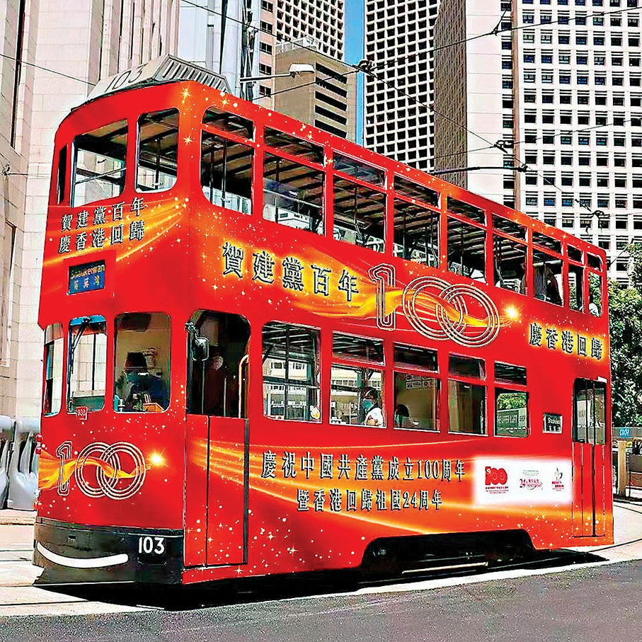 今年是中國共產黨成立100周年,也是香港回歸祖國24周年。臨近七一,慶祝的喜慶氣氛已在香港各區洋溢。在香港街頭,有電車車身噴上「賀建黨百年 慶香港回歸」等慶祝標語,迎接中國共產黨百年華誕和香港回歸祖國24周年紀念日的到來。