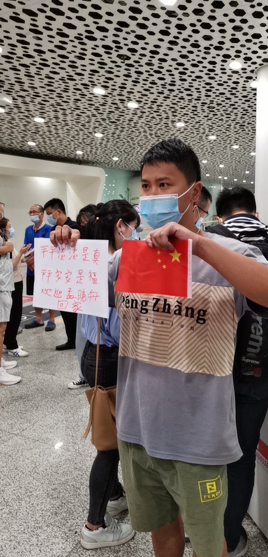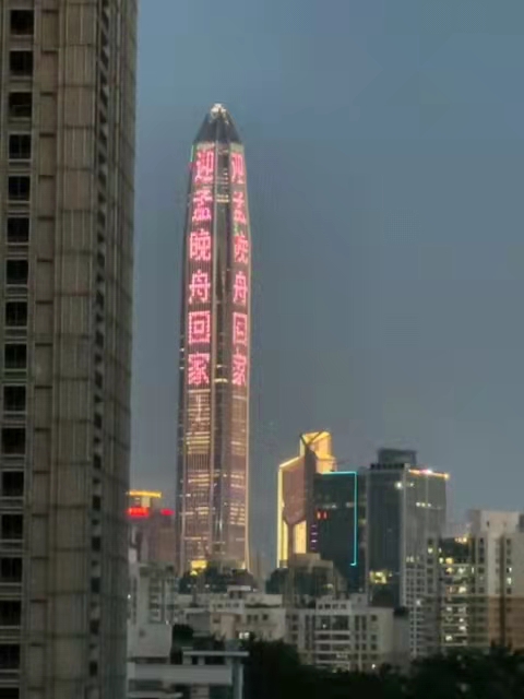 深圳第一高樓——平安金融中心晚上亮起「歡迎孟晚舟回家」的電子碼。不少熱心市民早早跑到深圳機場等待孟晚舟「回家」,很多市民手裏還舉着小紅旗。一位年輕的男子左手拿着五星紅旗,右手舉着「平平淡淡是真、平平安安是福,歡迎孟晚舟回家」的紙板。