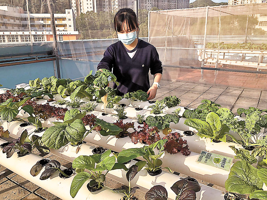 自2019/2020學年起,我校積極改善校園天台環境,並建設有機水耕場地,給予學生親身體驗水耕的種植方法。水耕場地種有羅馬生菜、菜芯、羽衣甘藍、小白菜等品種,並採用全有機種植,如運用苦楝油清除植物上的害蟲,而非採用殺蟲劑。在活動中,學生學習到水耕方法的原理、水循環、收割菜類的方法及其環保意義。此外,同學為學校資訊日拍攝了一段關於校園水耕的介紹短片,向公眾宣傳水耕及其好處,很有教育意義。