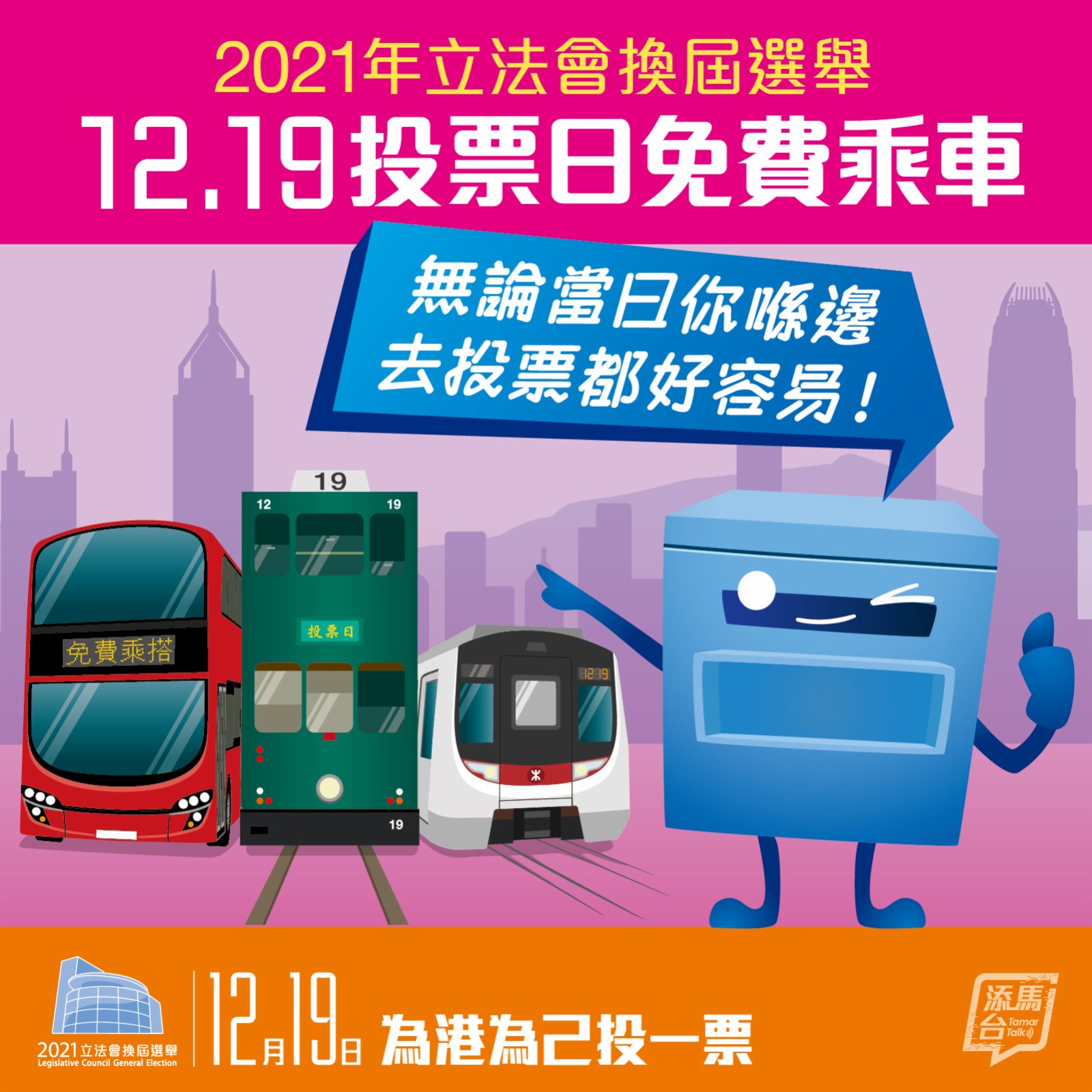 第七屆立法會換屆選舉投票日(19日)在即,政府今日(16日)在社交專頁「添馬台」發文,指投票當日市民可免費搭港鐵、巴士和電車,而投票時間是上午8時半至晚上10時半。