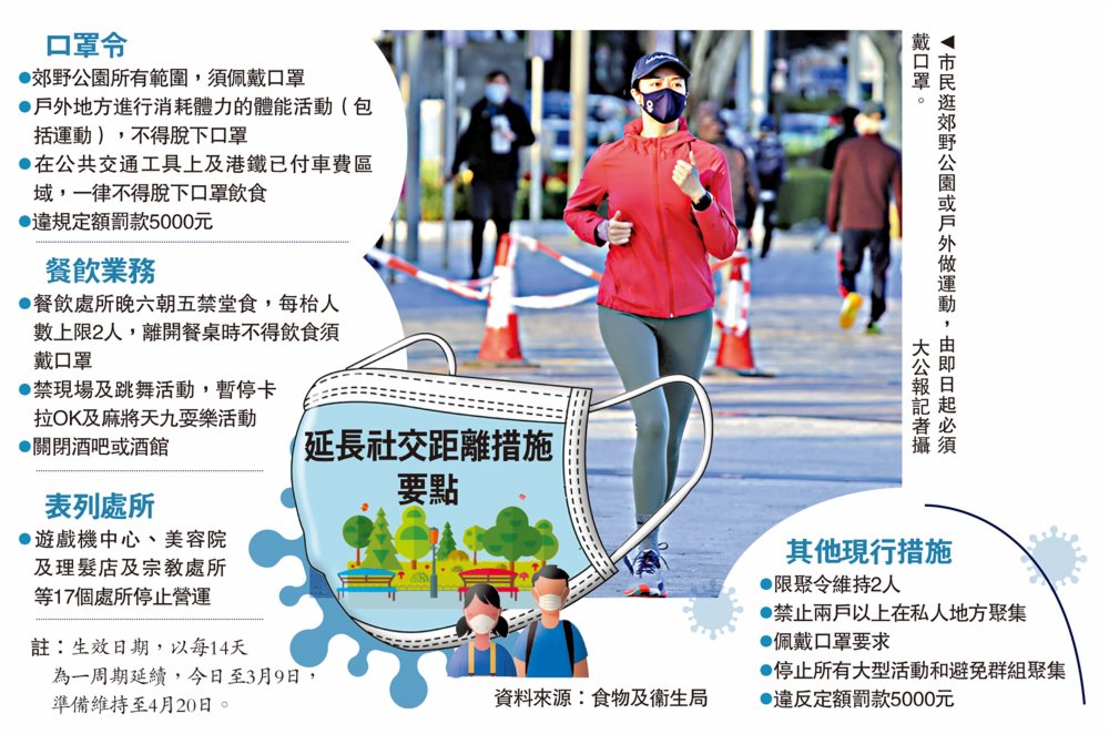 (大公報記者 梁淑貞)疫情下,到郊野公園行山避疫的人數大增,不少人去到郊外便除口罩。政府昨日宣布,已修訂《預防及控制疾病(佩戴口罩)規例》(第599I章),收緊「口罩令」的規定,在郊野公園內也不可以除口罩,而在戶外地方做運動時亦不可以除口罩,在公共交通工具上及港鐵已付車費區域,不能以飲食為理由脫下口罩。政府表示,因應疫情非常嚴竣,準備將收緊社交距離的措施維持至4月20日。