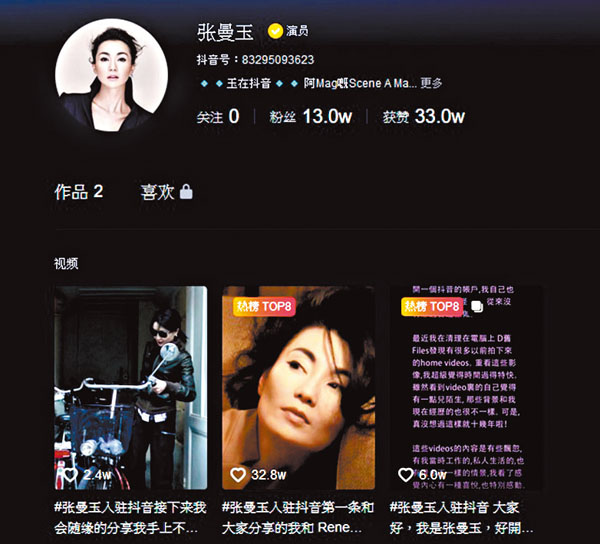 (香港文匯報記者 文芬)社交網絡平台影響力無遠弗屆 ,一向超級低調的「星爺」周星馳上月一反常態開設Instagram賬戶,而影后張曼玉(Maggie)近日她在毫無預警下開設抖音賬號,並分享兩段舊片。賬號開設3小時已吸納13.5萬粉絲,在短短2日間已經有接近44萬粉絲關注。