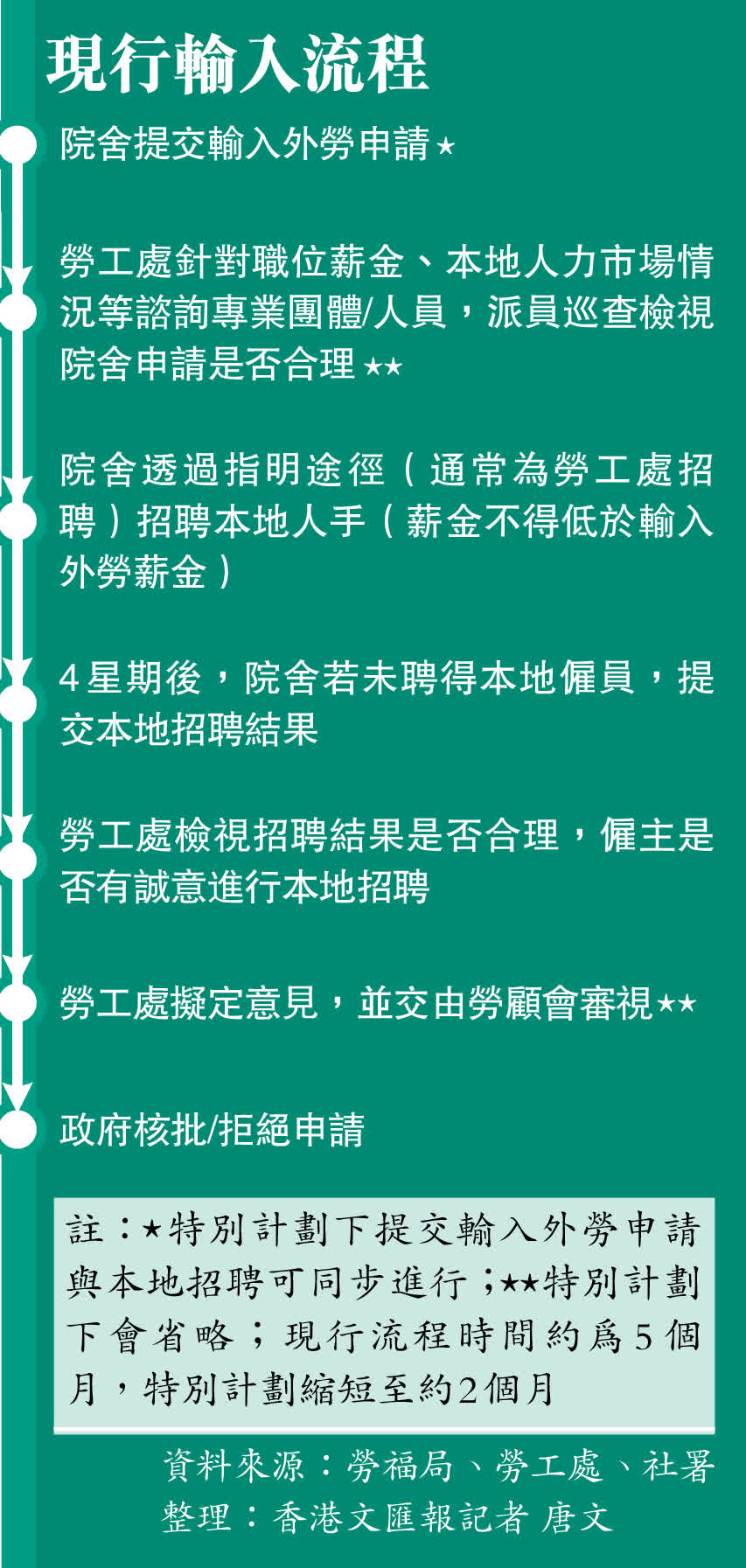她最終申請到16名內地護理員到港,加上本地員工,勉強可應付需求,惟她指出內地護理員的工作時效僅2年,約滿後又需重新申請,「按原來的計劃,要重新走所有流程,即係在本地請人請唔到,要到勞顧會及入境處走程序。」她希望「特別計劃」能簡化程序,以提升院舍服務質素。