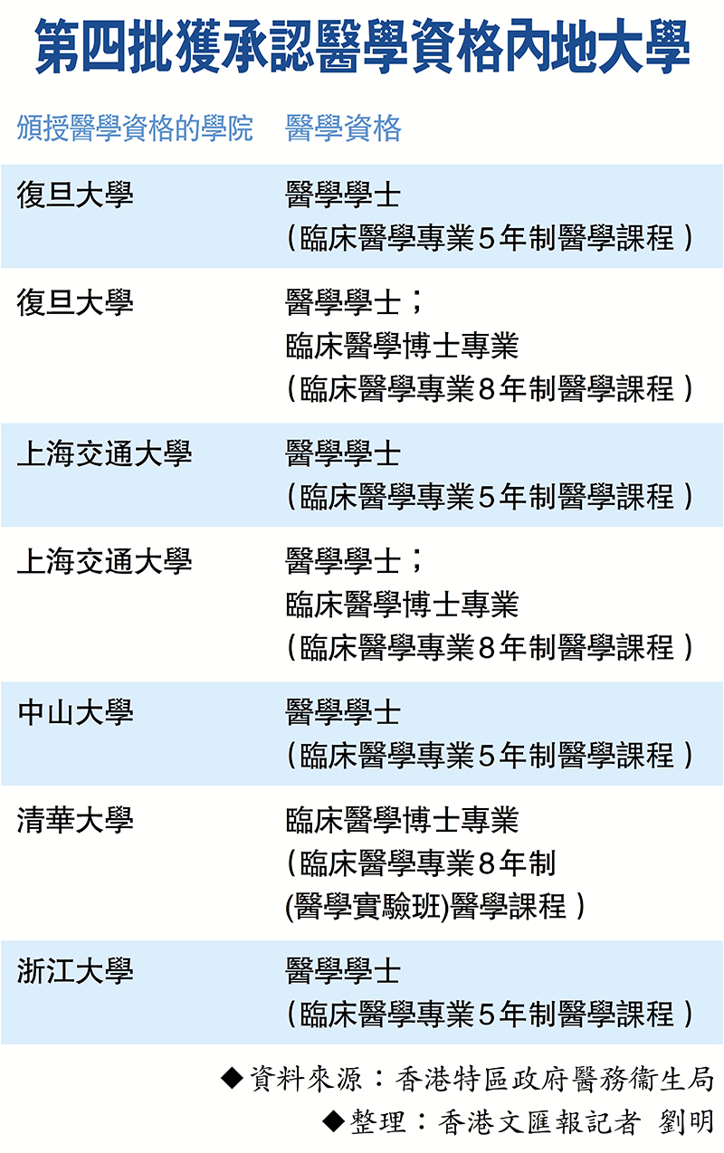 香港中華醫學會會董楊超發醫生昨日對香港文匯報表示,之前批出的名單以英、美、澳、加等地醫學院課程為主,第二及第三批才有三間內地院校上榜,今次再增加5間院校的7項醫學課程獲得認可,實屬好事。他強調所有院校的課程均經過特別註冊委員會審批,上榜的是內地名牌大學醫學院的課程,加上來港後會經培訓,以適應香港的制度,確保醫學水平。