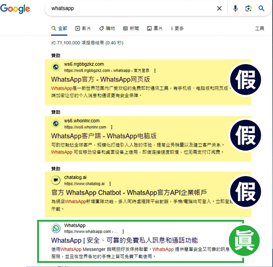 香港文匯報記者嘗試在Google搜尋「WhatsApp網頁版」,結果發現前列位置均是假冒網站。在點擊連結後,會進入與官方相似的假冒界面,要求用戶掃描QR Code登入。但和「正版」不同的是,頁面文字均以簡體字顯示,域名亦與官方不同。記者稍晚再次在Google輸入關鍵字進行搜尋,發現部分假冒網站已經消失,但不排除騙徒其後再重新製作假網站。