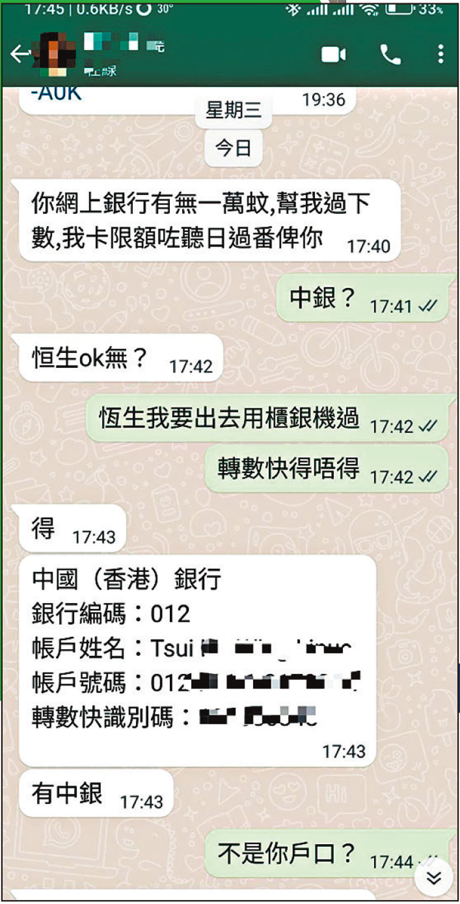 他表示,該騙徒上月25日在其賬戶冒充他向朋友借1萬元,訛稱銀行卡因限額問題未能過數,翌日會歸還款項,但騙徒所提供的銀行戶口用戶姓徐,亦非其姓名,故引起其朋友懷疑,致電向他查詢,他才知賬戶遭「騎劫」,其朋友亦未有損失。
