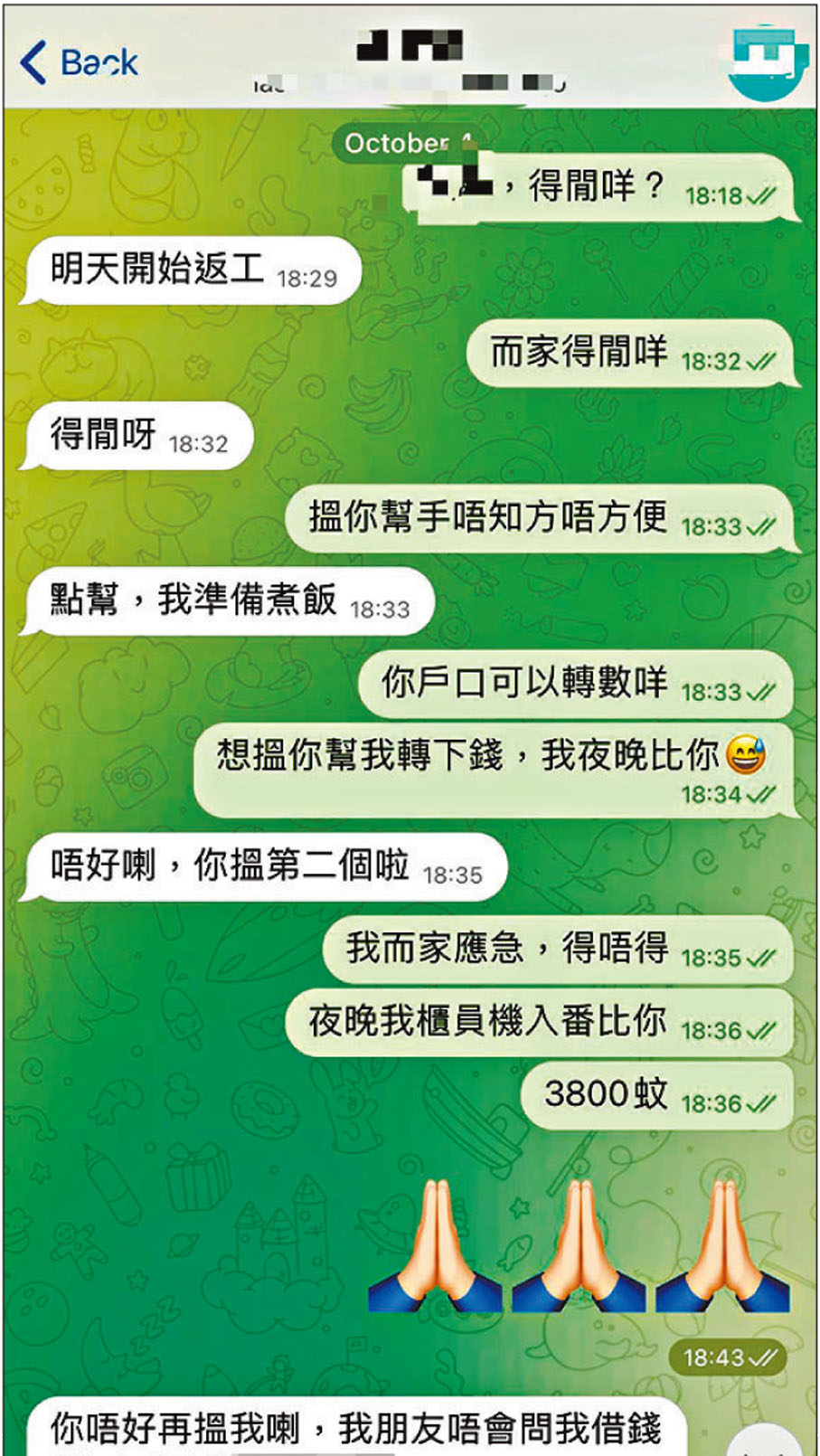 同一日,他胞妹的Telegram賬戶也被「騎劫」,並向他借3,500元,他同樣感到懷疑以戶口沒有錢打發對方,但騙徒死纏爛打要其幫忙,當中一句:「阿姨講話你信唔過?」令他更肯定對方是詐騙,「Telegram用戶是我個妹,但對方自稱阿姨,所以一定係假。」