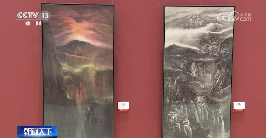 此次展示了樂震文、張弛這兩位藝術家伉儷歷年創作的優秀作品,在展覽中心,由樂震文創作的一幅高3.3米、寬11米的作品《直上浮雲》讓許多觀眾駐足,畫作以紅色為主色調,表現出長城蜿蜒曲折、氣勢磅礴的景象。高2.3米、寬7.4米,幾乎以墨色變化呈現的七條屏《雲壑聽泉》,是張弛此次帶來的新作之一,以雲靄為畫面主角,展現重巒疊嶂、巨岩深壑。
