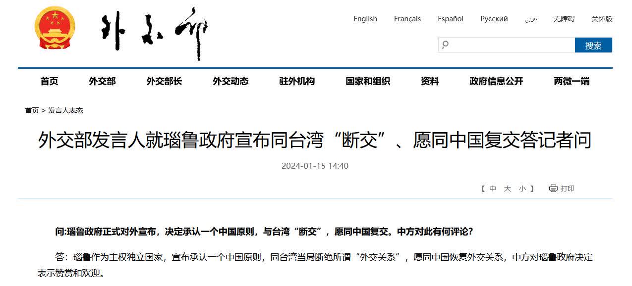 世界上只有一個中國,台灣是中國領土不可分割的一部分,中華人民共和國政府是代表全中國的唯一合法政府。這已為聯合國大會2758號決議所確認,是國際社會普遍共識。在一個中國原則基礎上,中國已同全世界182個國家建立外交關係。瑙魯政府決定同中國復交,再次充分說明,一個中國原則是人心所向,大勢所趨。