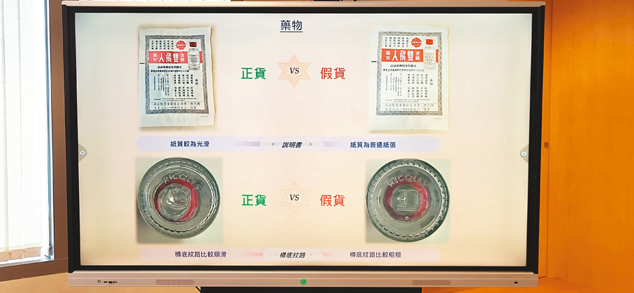 海關今次檢獲的冒牌貨品除藥物和中成藥外,還有潤膚品和防曬霜等。冒牌貨包裝及樽身仿真度極高,一般市民難辨真偽,但不法分子因應製作成本,在貨品說明書紙質、樽底紋路、商標清晰度及樽底批號數字等細節上處理較粗疏。以被偽冒的「雙飛人」藥水為例,正貨說明書紙質光滑,假貨較粗糙,正貨樽底紋路順滑,假貨樽底紋路較粗糙。