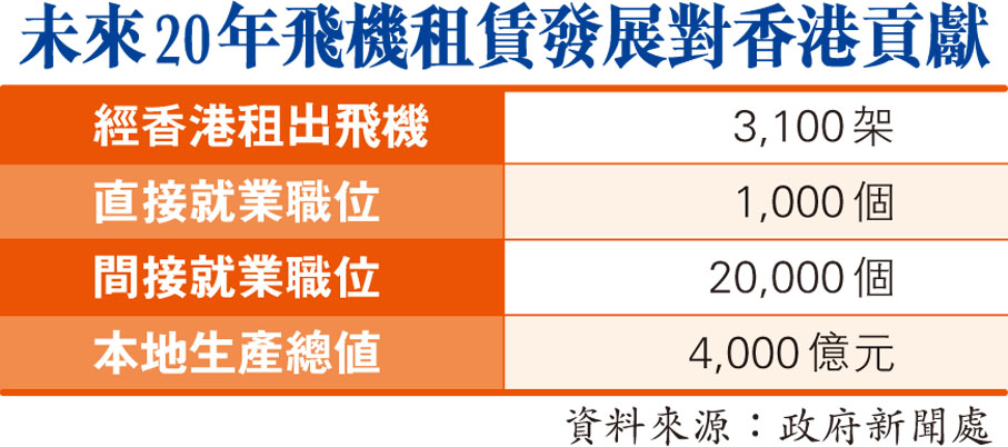 對政府而言,飛機租賃的經濟貢獻更是不容小覷。特區政府運輸及物流局今年2月預計,未來20年有約3,100架飛機會經香港平台出租,創造超過1,000個直接就業職位及約20,000個間接職位,累積增加本地生產總值超過4,000億元。