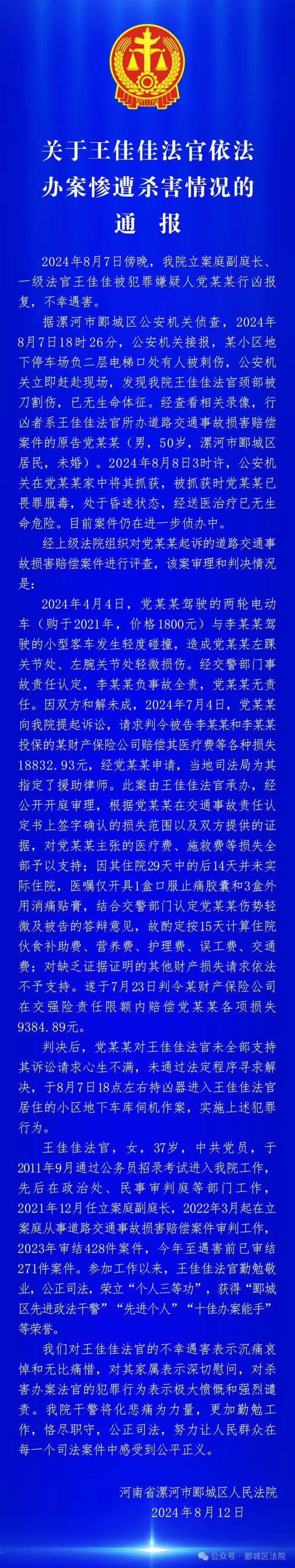 河南漯河市郾城區人民法院通報,8月7日傍晚,該院立案庭副庭長、一級法官王佳佳被犯罪嫌疑人黨某某行兇報復,不幸遇害。