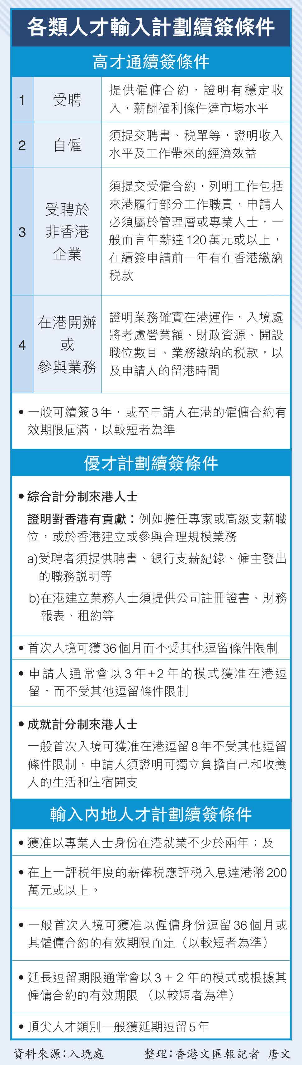 在續簽的問題上,特區政府近期公布了高才通計劃續簽的幾個條件,有好有不好,例如跨國公司的高管人才若在港繳稅,就有機會續簽,這是放寬的地方,但也有以合約制受僱的申請人,可能續簽一次只獲得幾個月的延長,就要再次申請。「重複申請不僅會造成行政資源的浪費,申請人也不易作出生活安排。」尚海龍希望明年3月後,首批高才通續簽大致完成,政府可根據續簽比例、申請人集中反饋的問題等,作出綜合檢討。