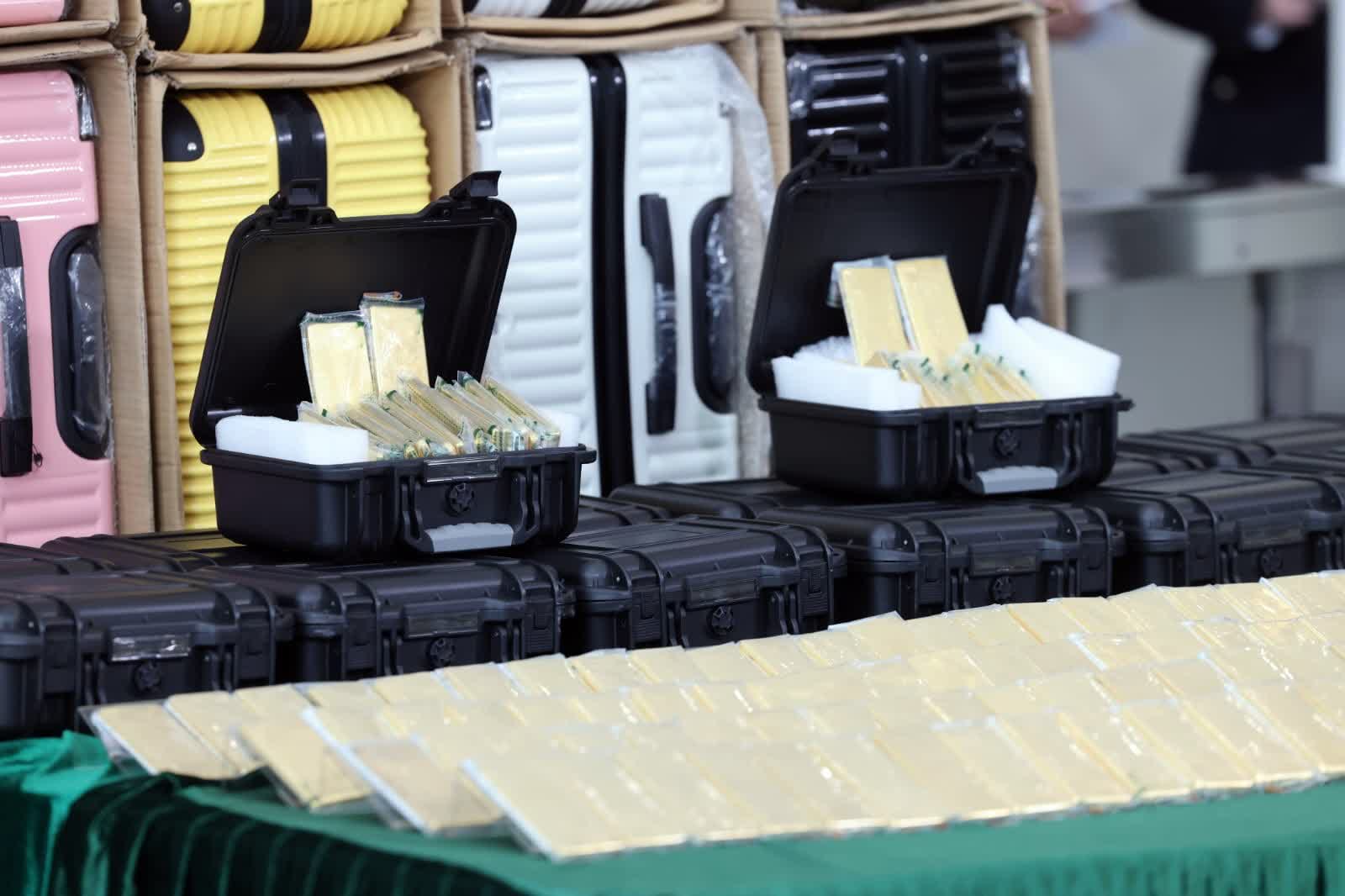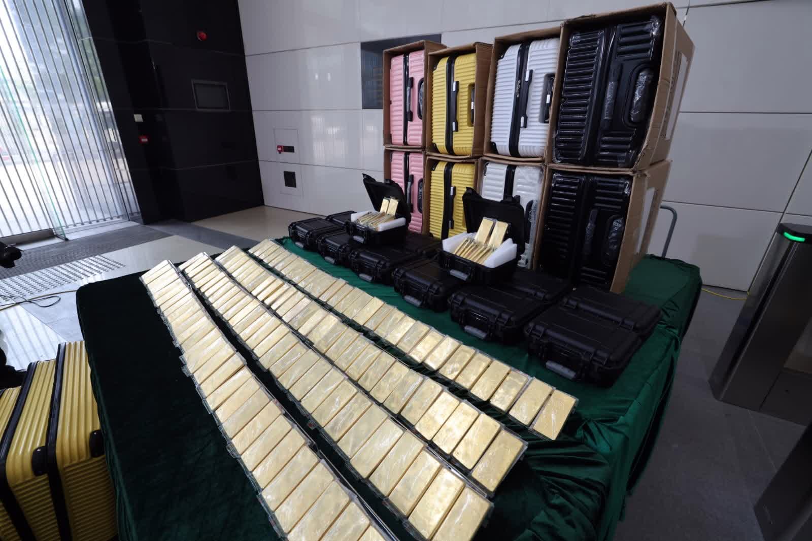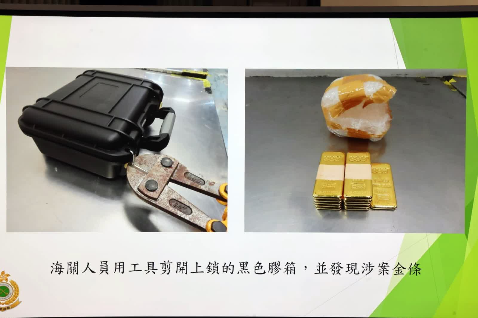 其後人員逐一打開紙箱檢查,發現每箱內裝有三個大箱套小箱行李箱,在最內層的小行李箱中則有一個異常沉重的紙箱,內有一個用兩把鎖鎖上的黑色小膠箱,撬開發現藏有一批金條。經點算,該14箱的行李箱中合共藏有145條,每條重1公斤的金條。