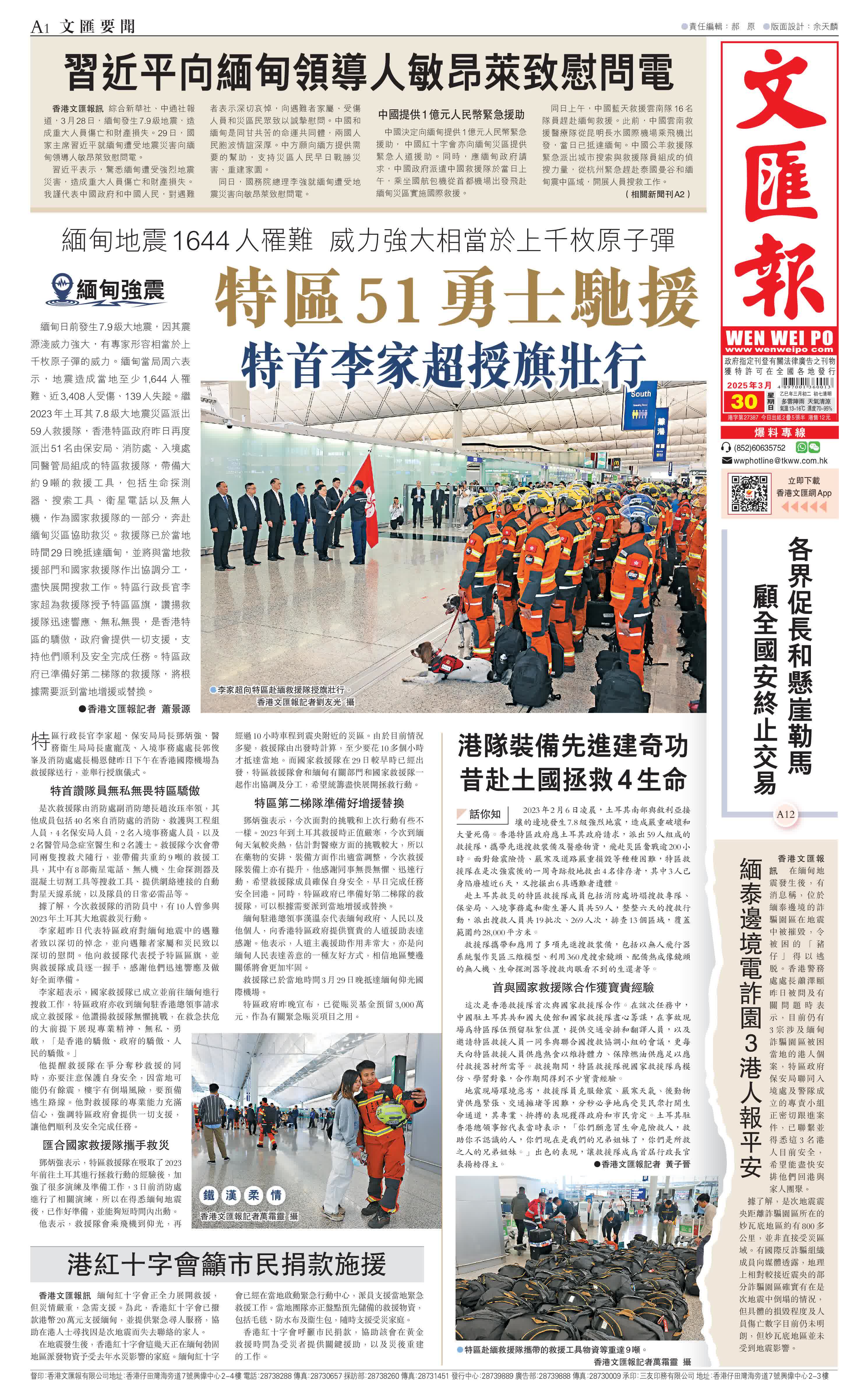 (香港文匯報記者 蕭景源)緬甸日前發生7.9級大地震,因其震源淺威力強大,有專家形容相當於上千枚原子彈的威力。緬甸當局周六表示,地震造成當地至少1,644人罹難、近3,408人受傷、139人失蹤。繼2023年土耳其7.8級大地震災區派出59人救援隊,香港特區政府昨日再度派出51名由保安局、消防處、入境處同醫管局組成的特區救援隊,帶備大約9噸的救援工具,包括生命探測器、搜索工具、衛星電話以及無人機,作為國家救援隊的一部分,奔赴緬甸災區協助救災。救援隊已於當地時間29日晚抵達緬甸,並將與當地救援部門和國家救援隊作出協調分工,盡快展開搜救工作。特區行政長官李家超為救援隊授予特區區旗,讚揚救援隊迅速響應、無私無畏,是香港特區的驕傲,政府會提供一切支援,支持他們順利及安全完成任務。特區政府已準備好第二梯隊的救援隊,將根據需要派到當地增援或替換。