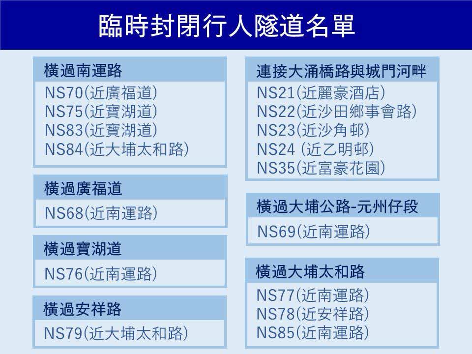 緊急控制中心亦會同時就最新的道路受阻情況及緊急事故跟進工作,與其他相關部門緊密聯繫,為政府全面處理緊急事故提供支援。此外,因應惡劣天氣及風暴潮,路政署會逐步封閉位於沙田城門河、大埔林村河及大埔河沿岸的16條行人隧道,詳看下圖。