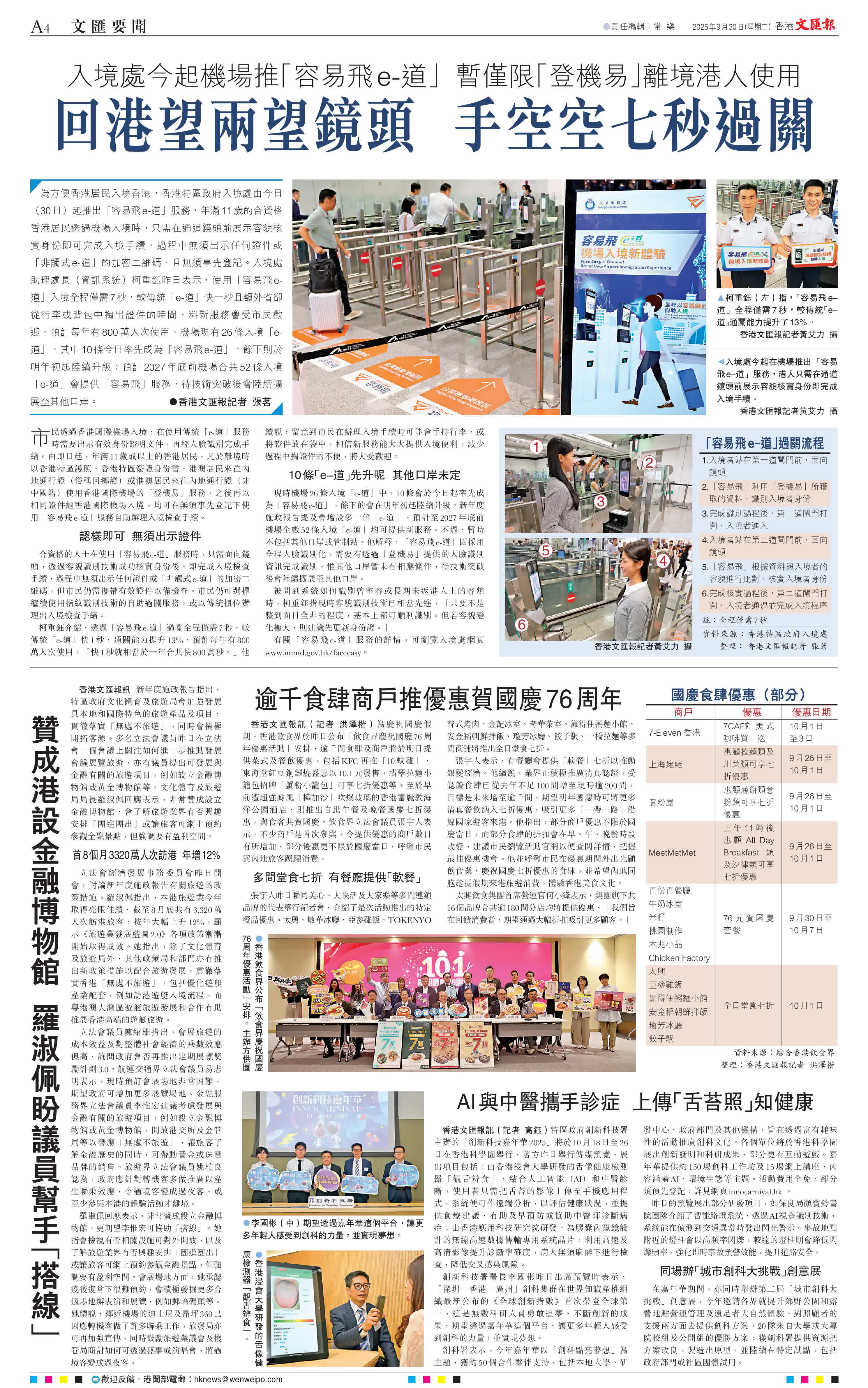 (香港文匯報記者 張茗)為方便香港居民入境香港,香港特區政府入境處由今日(30日)起推出「容易飛e-道」服務,年滿11歲的合資格香港居民透過機場入境時,只需在通道鏡頭前展示容貌核實身份即可完成入境手續,過程中無須出示任何證件或「非觸式e-道」的加密二維碼,且無須事先登記。入境處助理處長(資訊系統)柯重鈺昨日表示,使用「容易飛e-道」入境全程僅需7秒,較傳統「e-道」快一秒且額外省卻從行李或背包中掏出證件的時間,料新服務會受市民歡迎,預計每年有800萬人次使用。機場現有26條入境「e-道」,其中10條今日率先成為「容易飛e-道」,餘下則於明年初起陸續升級;預計2027年底前機場合共52條入境「e-道」會提供「容易飛」服務,待技術突破後會陸續擴展至其他口岸。