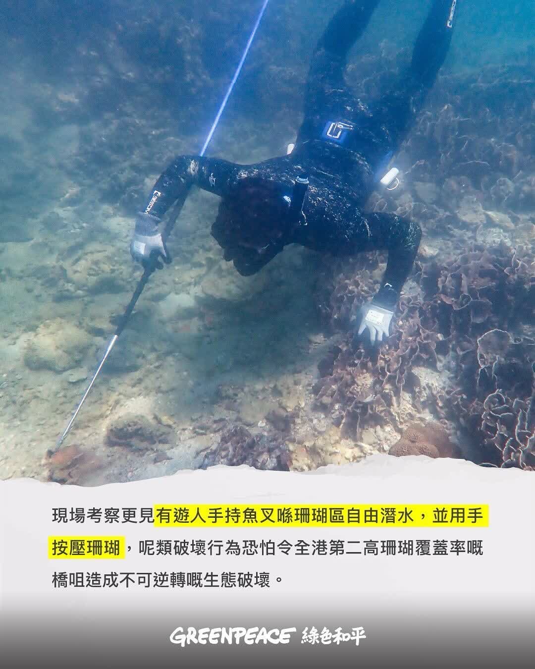綠色和平引述海洋生態專家指出,珊瑚一旦受損,有可能連帶破壞其他生物的棲息空間,甚至整個海洋生態系統,而要自然修復更非一朝一夕;促請政府制定以保育為優先生態旅遊政策框架,包括就西貢海島進行全面承載力研究。