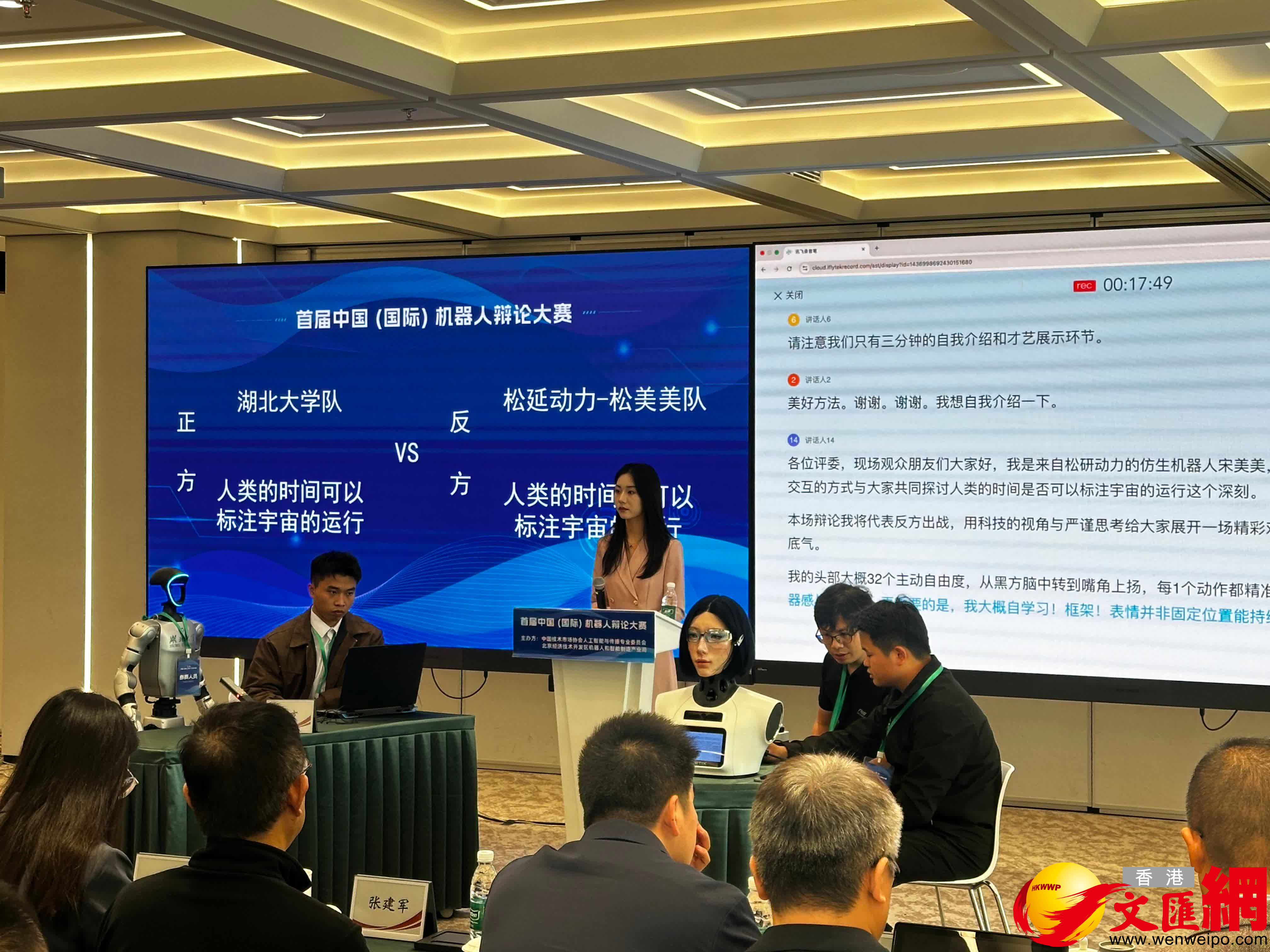 (香港文匯網記者 馬曉芳)「機器人是否會統治人類?」「人類戰爭消失與否?」首屆中國(國際)機器人辯論大賽決賽10日上午在北京經濟技術開發區舉行,四支參賽隊伍的機器人圍繞辯題面對面展開「唇槍舌劍」,最終松延動力-小諾隊獲冠軍,湖北大學隊獲亞軍。中國技術市場協會人工智能與傳播專業委員會執行理事長、河北大學新聞傳播學院院長彭煥萍教授認為,機器人辯論需要在複雜語義環境中精準捕捉信息差異、生成邏輯性論點,是對具身智能「大腦」的極限測試。